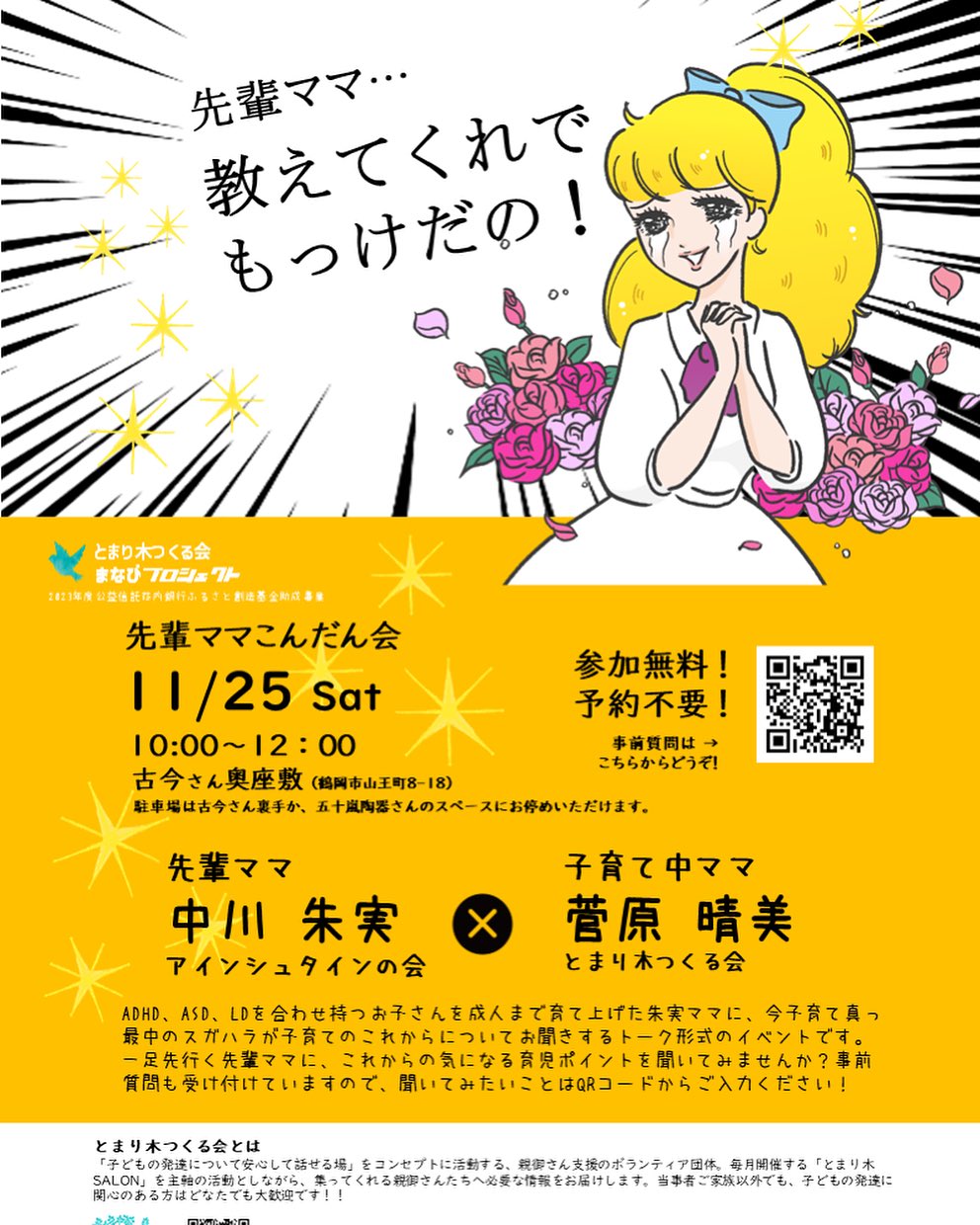 お子さんを成人まで育て上げた先輩ママ、朱実さんをゲストにお迎えし、実際の子育ての経験談をお聞きするトークライブイベントです!