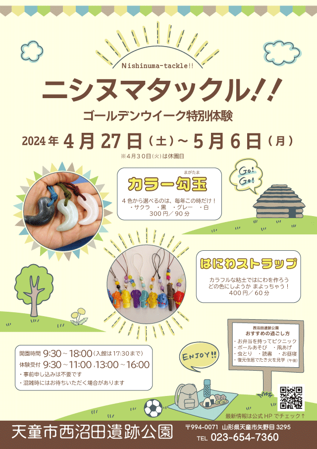 連絡先 | 指定管理者: NPO法人西沼田サポーターズ・ネットワーク 天童市西沼田遺跡公園 TEL: 023-654-7360(9:30~18:00、月曜休園) FAX:023-654-7360 E-mail: info@nishinumata.or.jp |