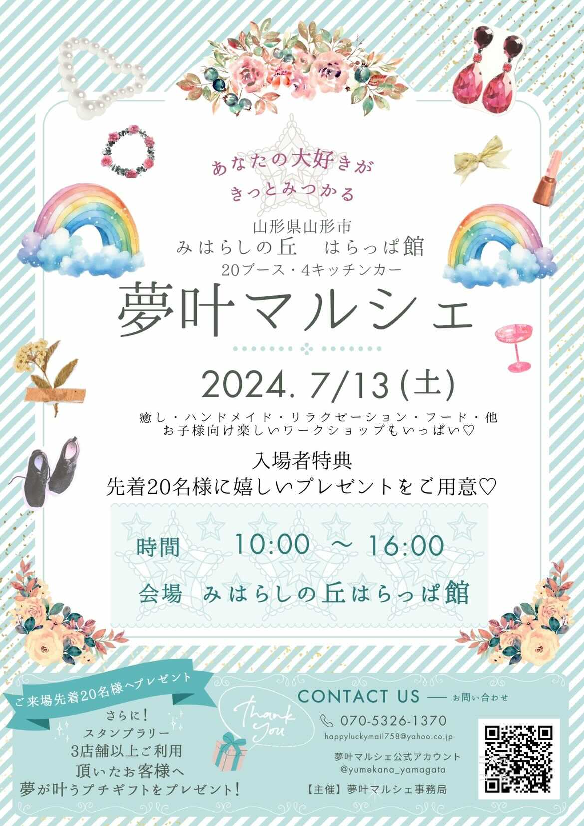 連絡先 | 【主催】 夢叶マルシェ事務局 お問い合わせ 070-2326-1370 happyluckymail758@yahoo.co.jp InstagramDM @yumekana_yamagata |