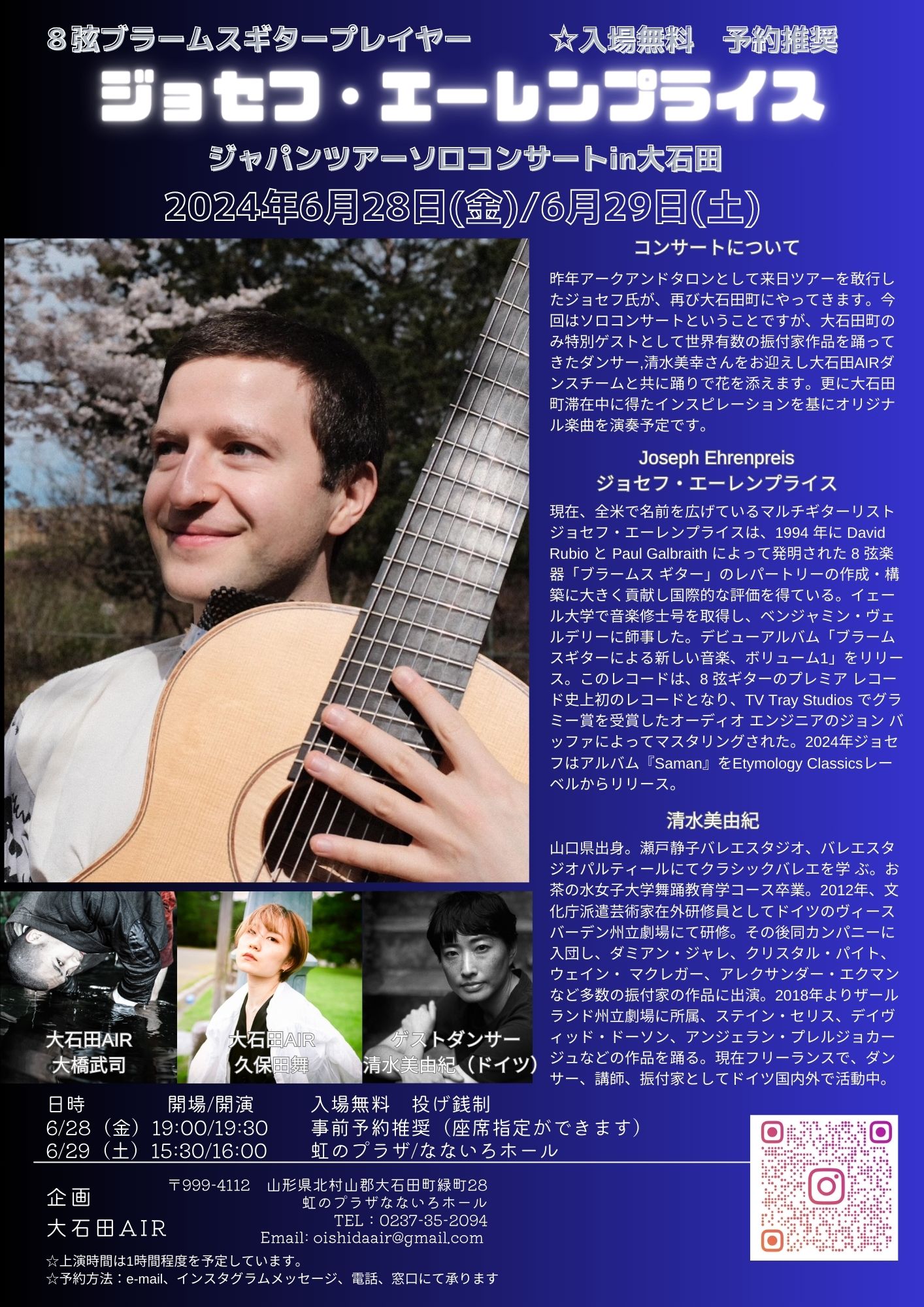 一流ギターリストであるジョセフ・エーレンプライス氏が大石田町でコンサートを行います。