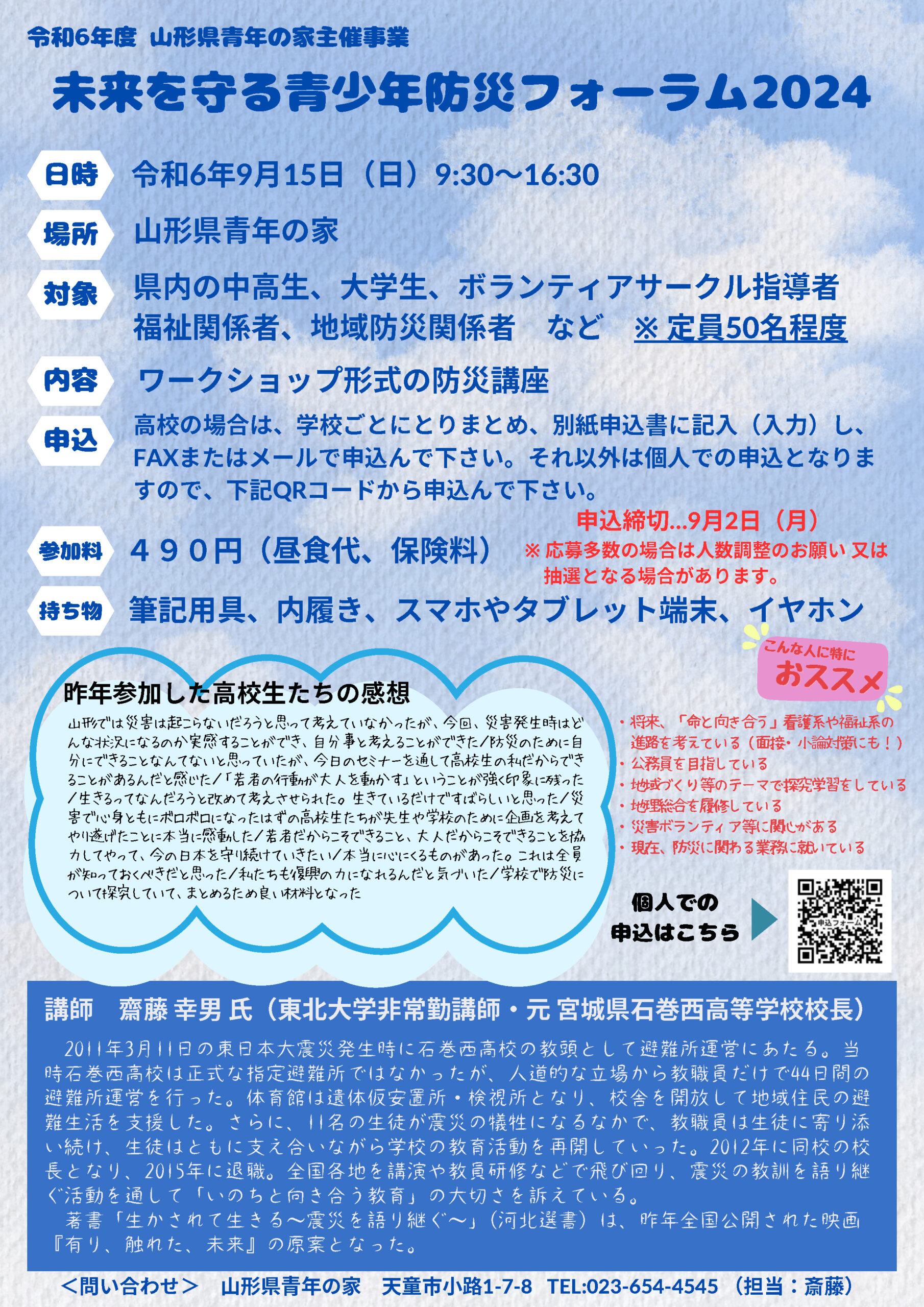 添付ファイル | 「未来を守る青少年防災フォーラム2024」チラシ |