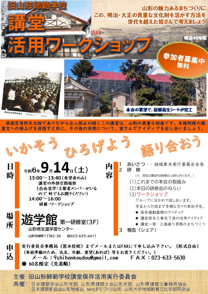 連絡先 | 旧山形師範学校講堂保存活用実行委員会(担当/黒木) mail:9shihankoudou@gmail.com FAX:023-633-5630 |
