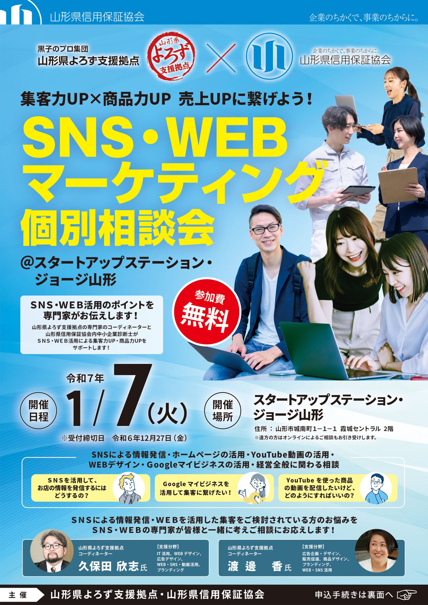 この相談会では、山形県よろず支援拠点のSNSとWEB活用を専門とするコーディネーターと、山形県信用保証協会の中小企業診断士資格を有する職員が相談をお聞きし、SNS・WEBを活用した情報発信や集客力増加等の悩みを一緒考え、解決いたします。