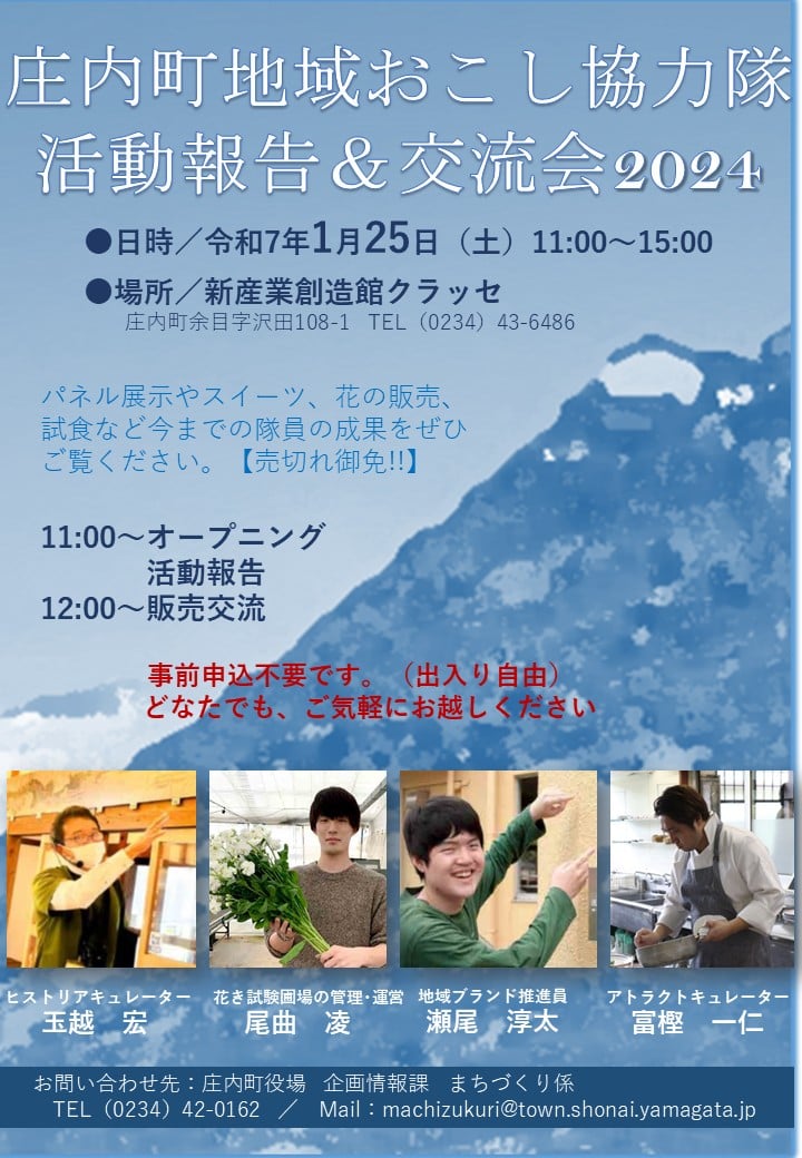 添付ファイル | 庄内町地域おこし協力隊活動報告&交流会2024チラシ |