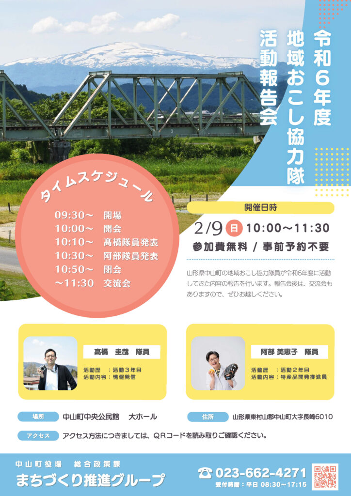 添付ファイル | 令和6年度中山町地域おこし協力隊活動報告会 チラシ |