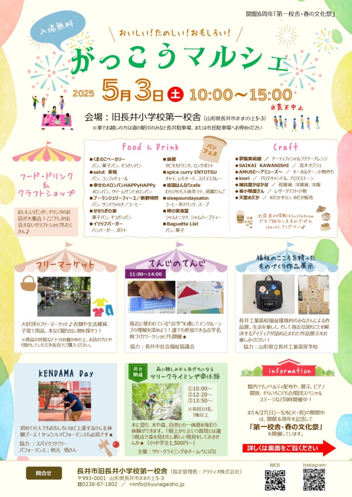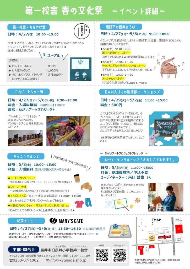 連絡先 | 長井市旧長井小学校第一校舎(指定管理者:アクティオ株式会社) ?0238-87-1802 (チラシにメールアドレスも記載されています) |