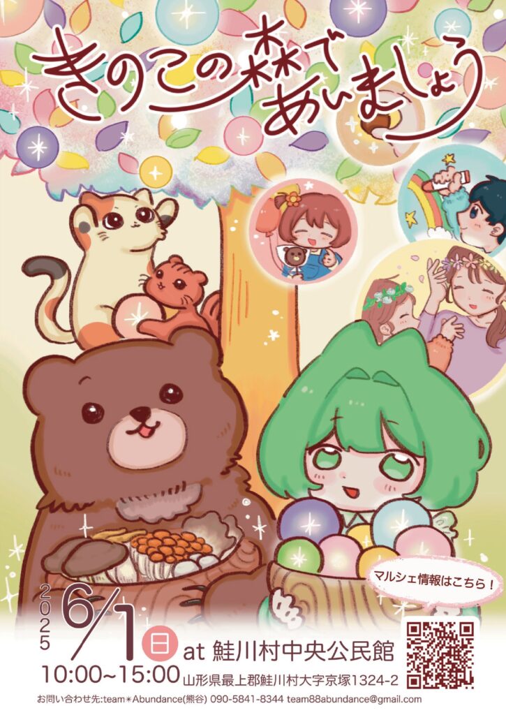 主催者 | 主催:きのこの森であいましょう実行委員会 team*Abundance 後援:鮭川村、鮭川村観光協会、鮭川村菌茸連絡協議会 協力:株式会社新庄•鈴木・柴田組、鮭川村連合婦人会、鮭川村食生活改善推進協議会、鮭川村ポランティアサークル、さけがわ友遊クラプ 音響協力:Sound System HAGGAR FARM |