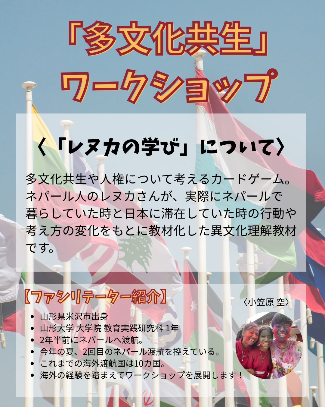 「レヌカの学び」という多文化共生や人権について考えるカードゲームを使って、「思い込み」や「偏見」などに目を向けながら学べる時間となっています。 グローバル化が進み、外国の人や文化と触れ合う機会が多くなった今だからこそ、このワークショップをやる価値があると思っています! 僕自身、これまで海外10カ国に渡航してきました。その経験も踏まえて、場をつくります! ぜひ、ご参加よろしくお願いします。