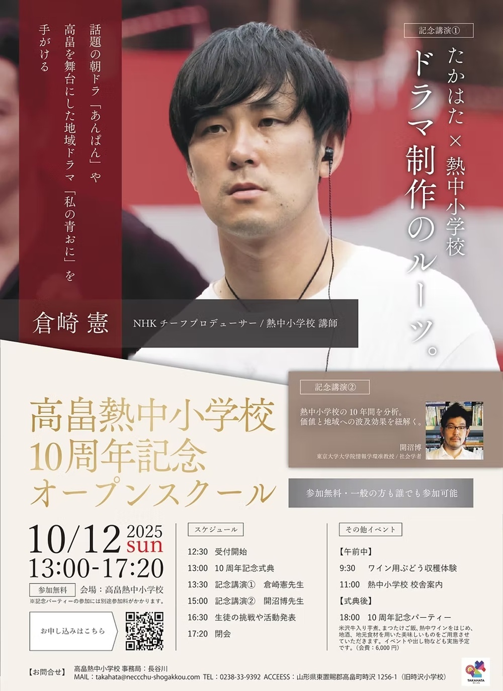 記念講演として高畠町を舞台にしたBSドラマ「私の青おに」や現在放映中の朝ドラ「あんぱん」のプロデューサーを務める倉崎憲先生にドラマ制作のルーツのお話、東京大学大学院情報学環准教授で社会学者として活躍される開沼博先生に「熱中小学校が10年間どのように継続してきたのか」について客観的なレポートとしてまとめていただく予定をしています。