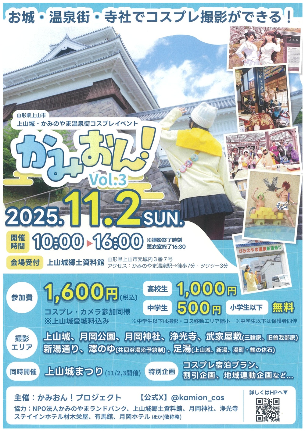 主催者 | 主催:かみおん!プロジェクト 協力:NPO法人かみのやまランドバンク、上山城郷土資料館、月岡神社、浄光寺、ステイインホテル材木栄屋、有馬館、月岡ホテル ほか |