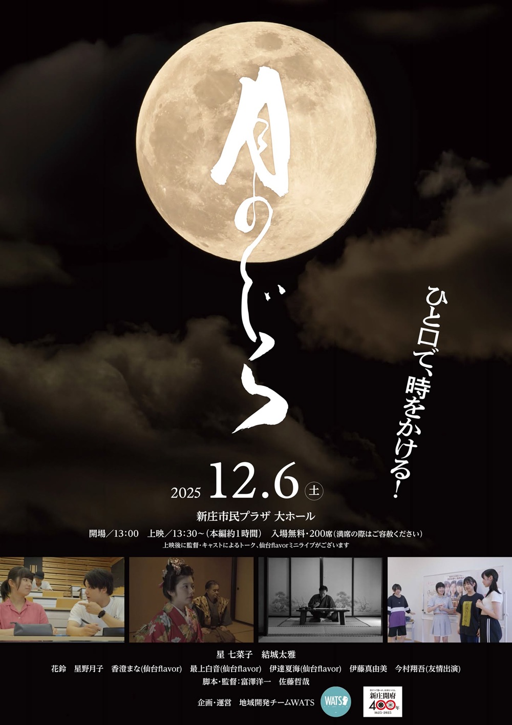 映画は、新庄まつりの起源に迫る時代劇で、江戸時代の新庄藩主が現代の大学生に乗り移る物語です。直木賞作家・今村翔吾さんの特別出演、東北農林専門職大学学長の友情出演、市民キャストの参加など、地域一体で制作しました。
