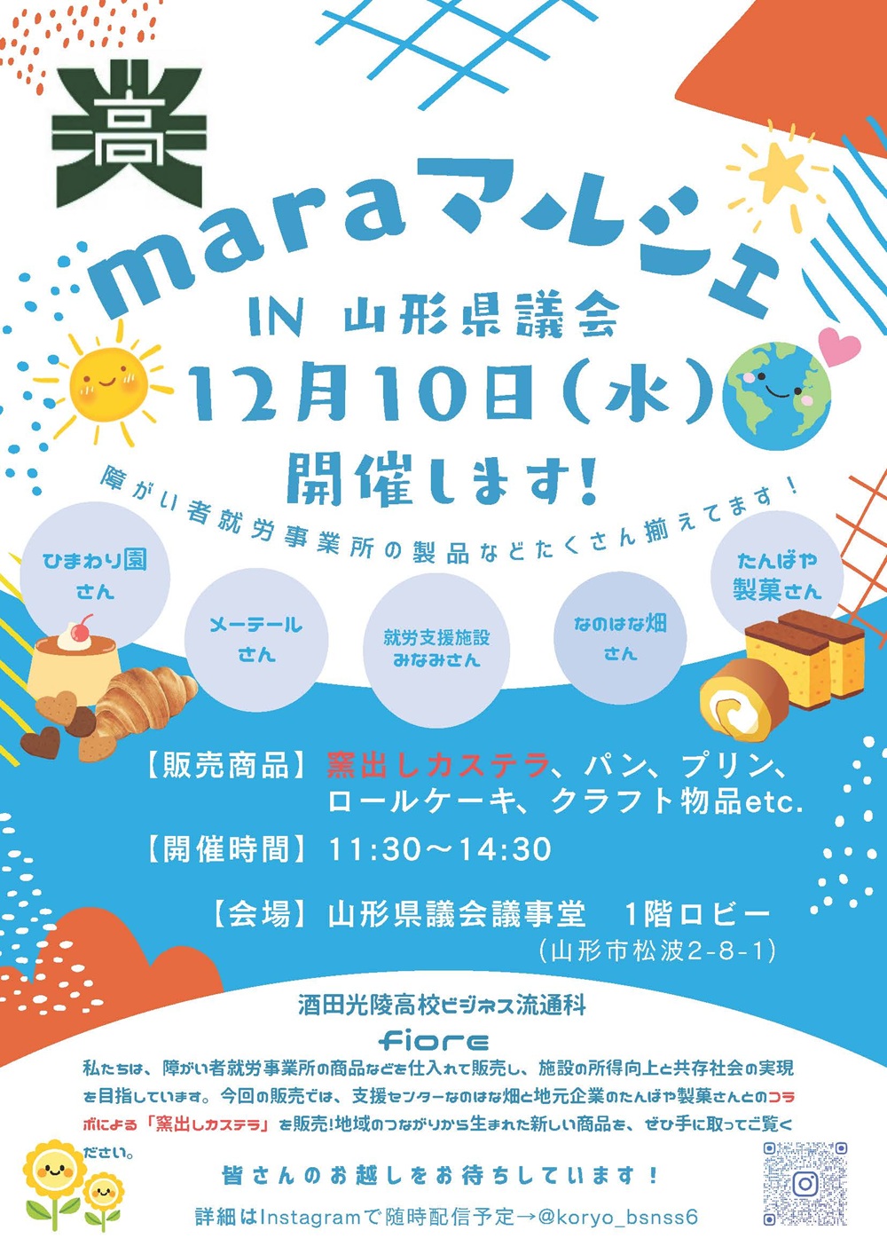 今回は、「maraマルシェin山形県議会」として、県立酒田光陵高等学校ビジネス流通科の生徒さんが、障がい者就労事業所等製品の販売実習を行います。
