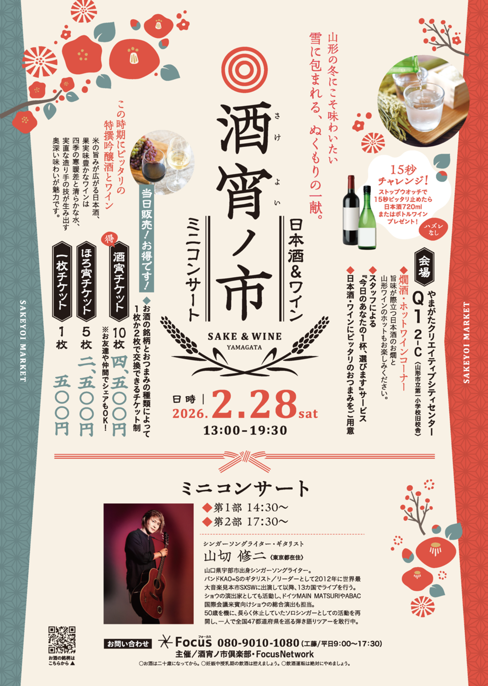 当日は、国内外で活躍するシンガーソングライター・山切修二さんをお迎えし、弾き語りミニコンサートも開催(①14:30~ ②17:30~)。 お酒のアテにぴったりなおつまみと共に、心地よい音楽をお楽しみください。