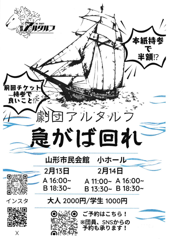 2026年 2月 13日(金曜日) 0:00~ 劇団アルタルフ 急がば回れ 会場:山形市民会館 小ホール (山形市香澄町 2-9-45) 劇団アルタルフ 急がば回れ 【日時】 2月13日(金) 2月14日(土) A 16:00~ A 11:00~ 16:00~ B 18:30~ B 13:30~ 18:30~ 【場所】 山形市民会館 小ホール 【料金】 大人2,000円/学生1,000円 ★前回のチケット持参でよいことあるかも!? 主催者 劇団アルタルフ 記事番号:29793