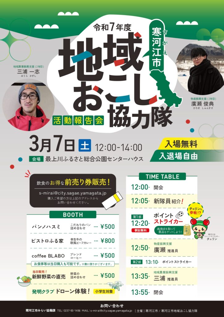都市部から移住し、寒河江市内で地域おこし協力隊として活動している隊員2名による令和7年度の活動報告会を開催します。それぞれのミッションの達成に向かい、地域の方々と協力して活動してきた取り組みなどを報告します。