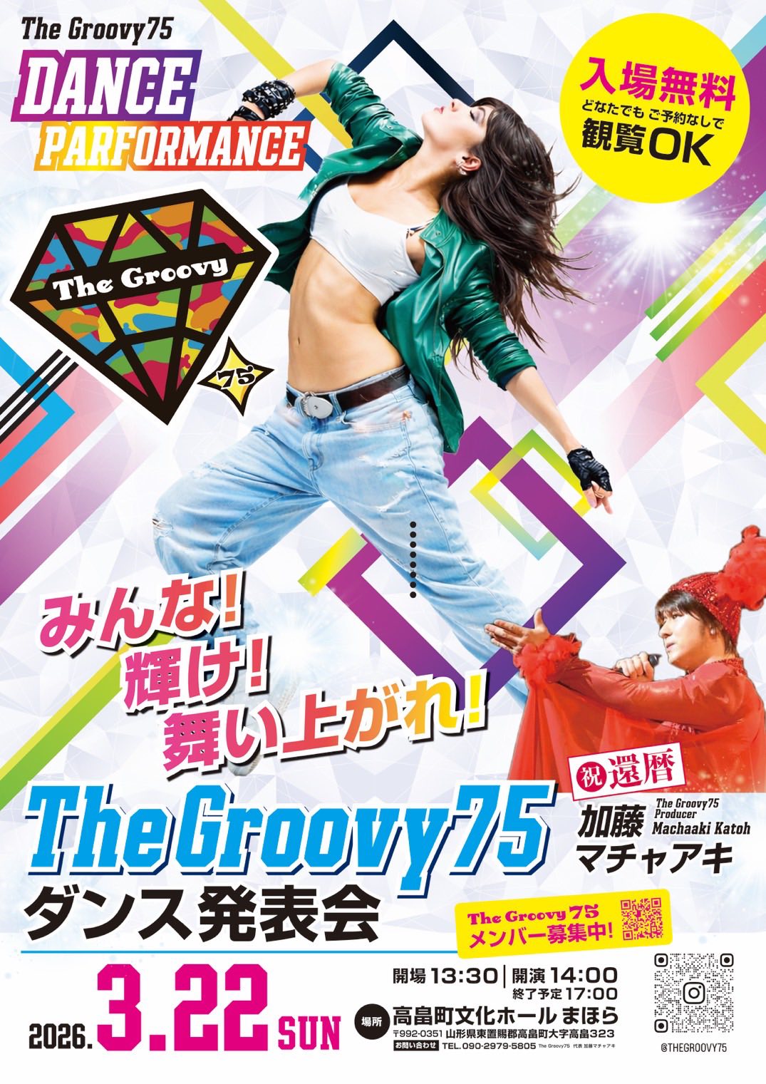 2026年 3月 22日(日曜日) 14:00~ The Groovy75 ダンス発表会 会場:高畠町文化ホールまほら (山形県東置賜軍高畠町大字高畠323) The Groovy75 ダンス発表会 みんな!輝け!舞い上がれ! 備考 日時:2026年3月22日(日) 開場13:30 開演14:00 終了予定17:00 場所:高畠文化ホールまほら (山形県東置賜郡高畠町大字高畠323) ※入場無料!どなたでもご予約なしで観覧OK! 連絡先 The Groovy 75 代表 加藤マチャアキ 記事番号:30075