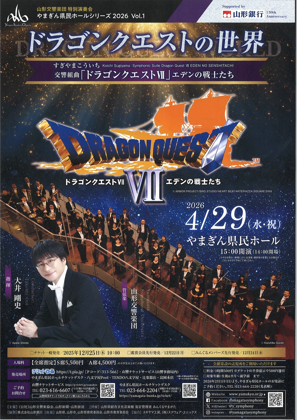 | 主催者 | 主催:公益社団法人山形交響楽協会、山形新聞・山形放送 共催:山形県総合文化芸術館 指定管理者 みんぐるやまがた 協賛:株式会社山形銀行 後援:山形県、山形市、山形県教育委員会、山形市教育委員会 協力:スギヤマ工房、株式会社スクウェア・エニックス |