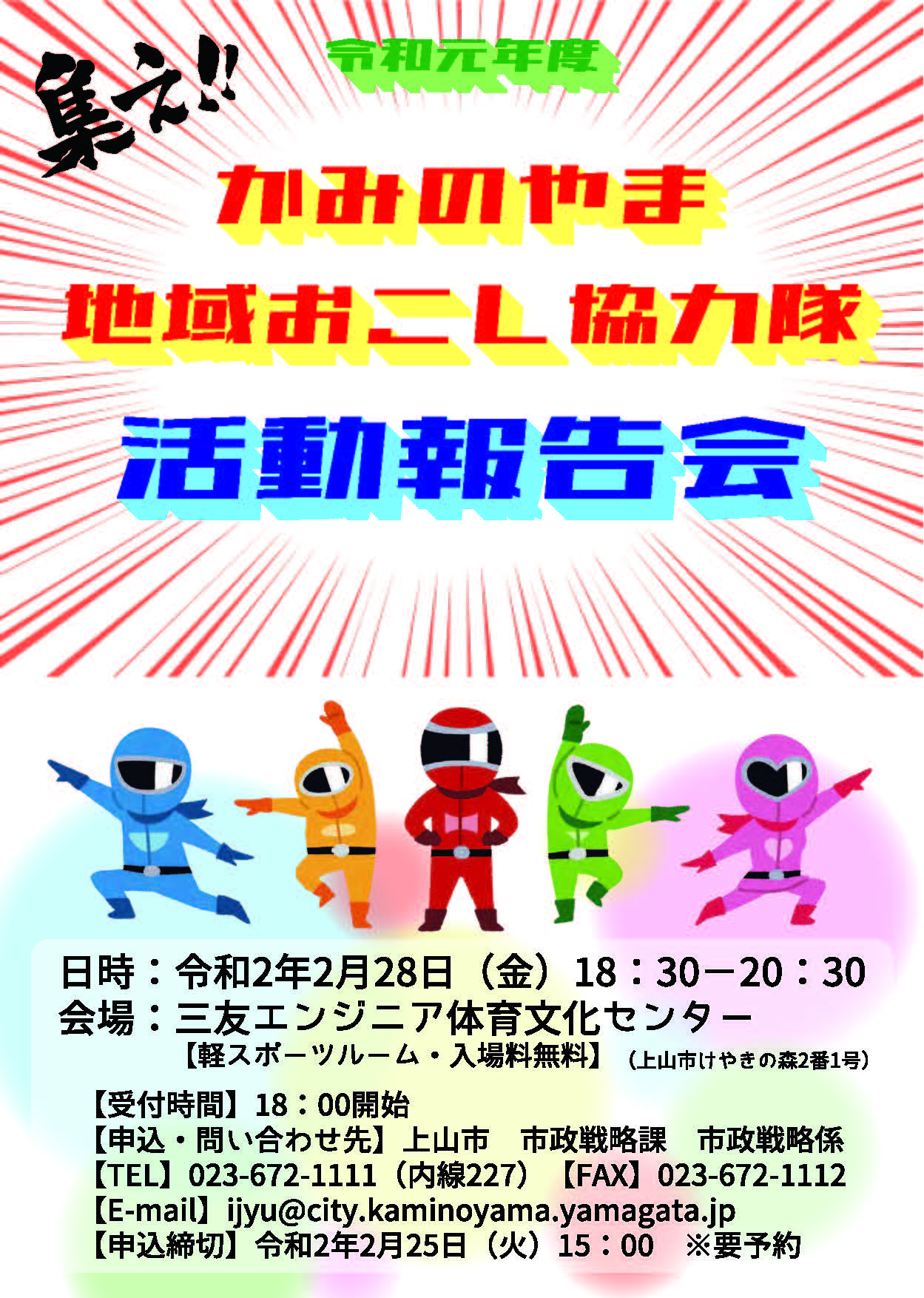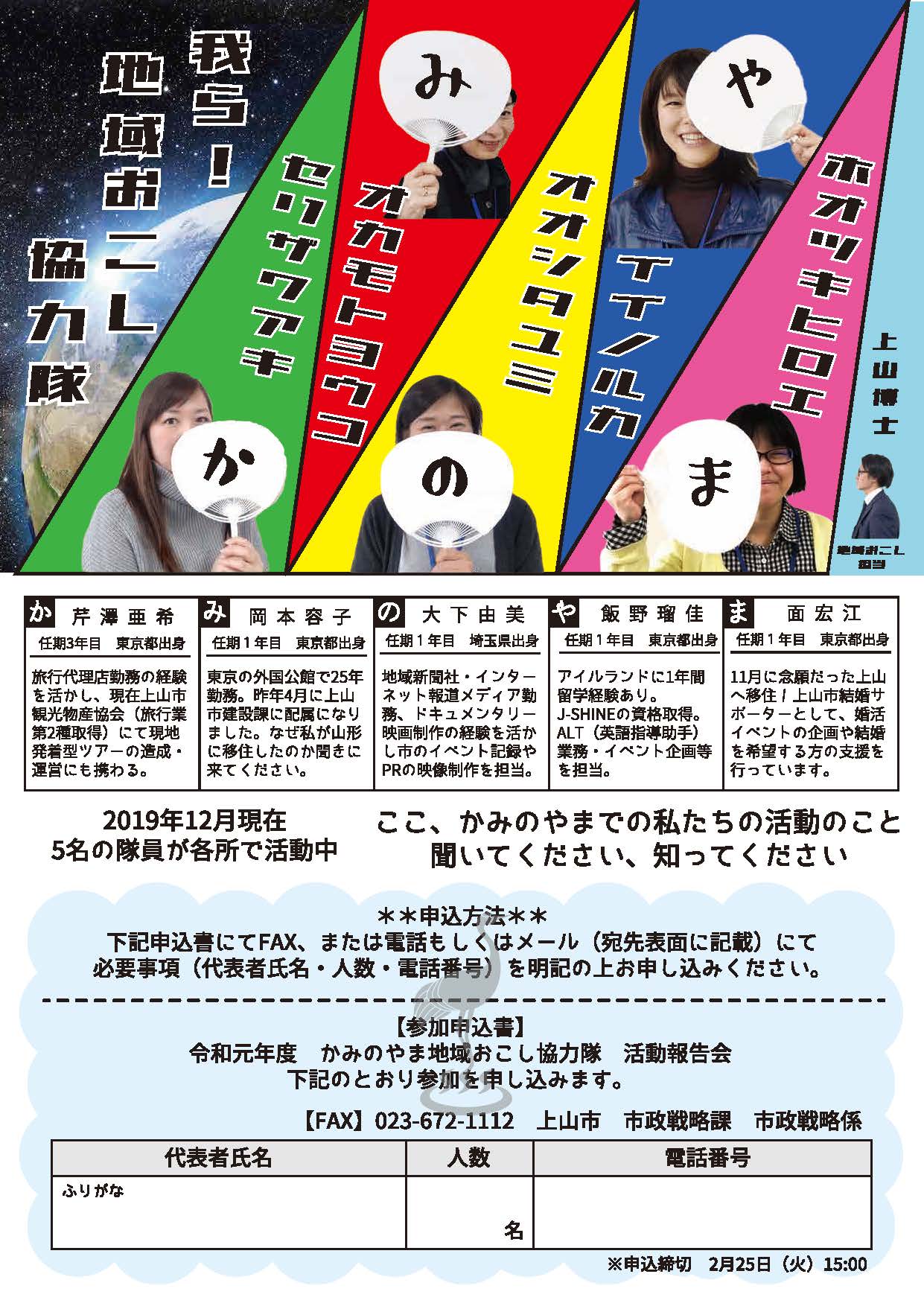 添付ファイル | 【上山市】令和元年度 かみのやま地域おこし協力隊活動報告会チラシ |