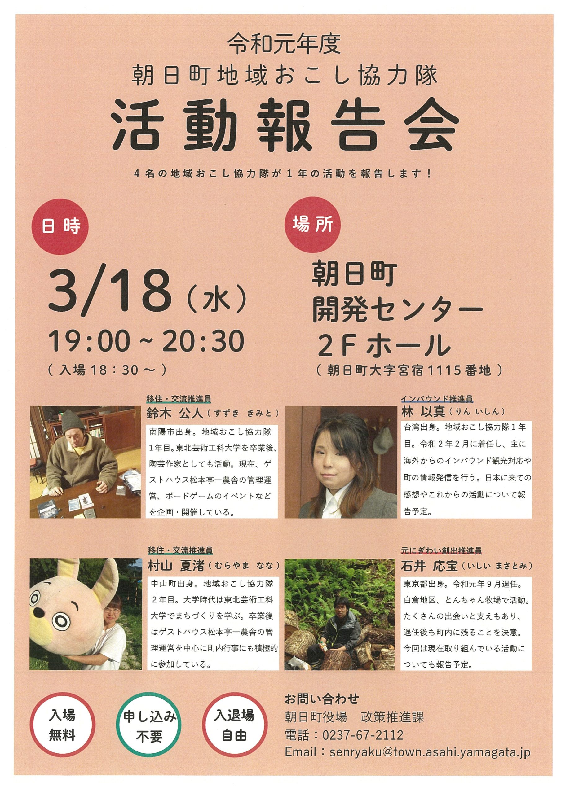 2020年 3月 18日(水曜日) 19:00~ <開催延期>朝日町地域おこし協力隊報告会 添付ファイル 朝日町地域おこし協力隊報告会ちらし 連絡先 朝日町役場 政策推進課 電話:0237-67-2112 E-mail:senryaku@town.asahi.yamagata.jp 記事番号:4725
