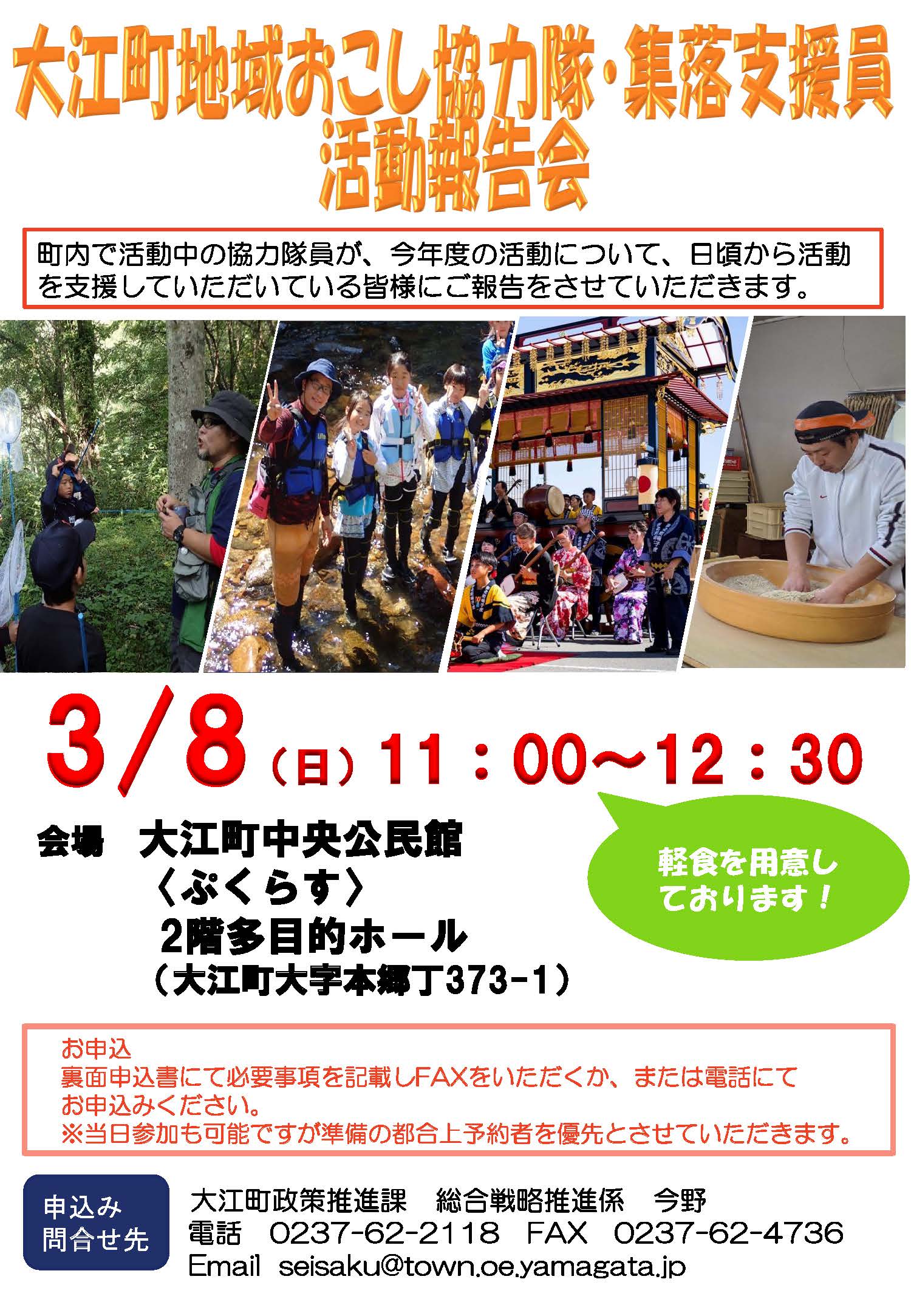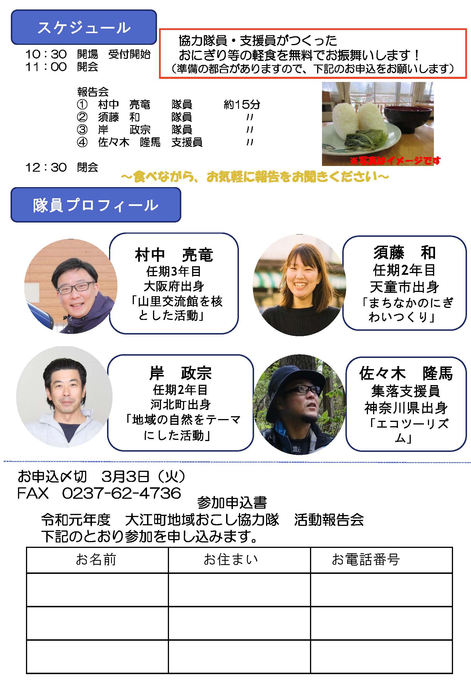 添付ファイル | 大江町地域おこし協力隊・集落支援員活動報告会ちらし |