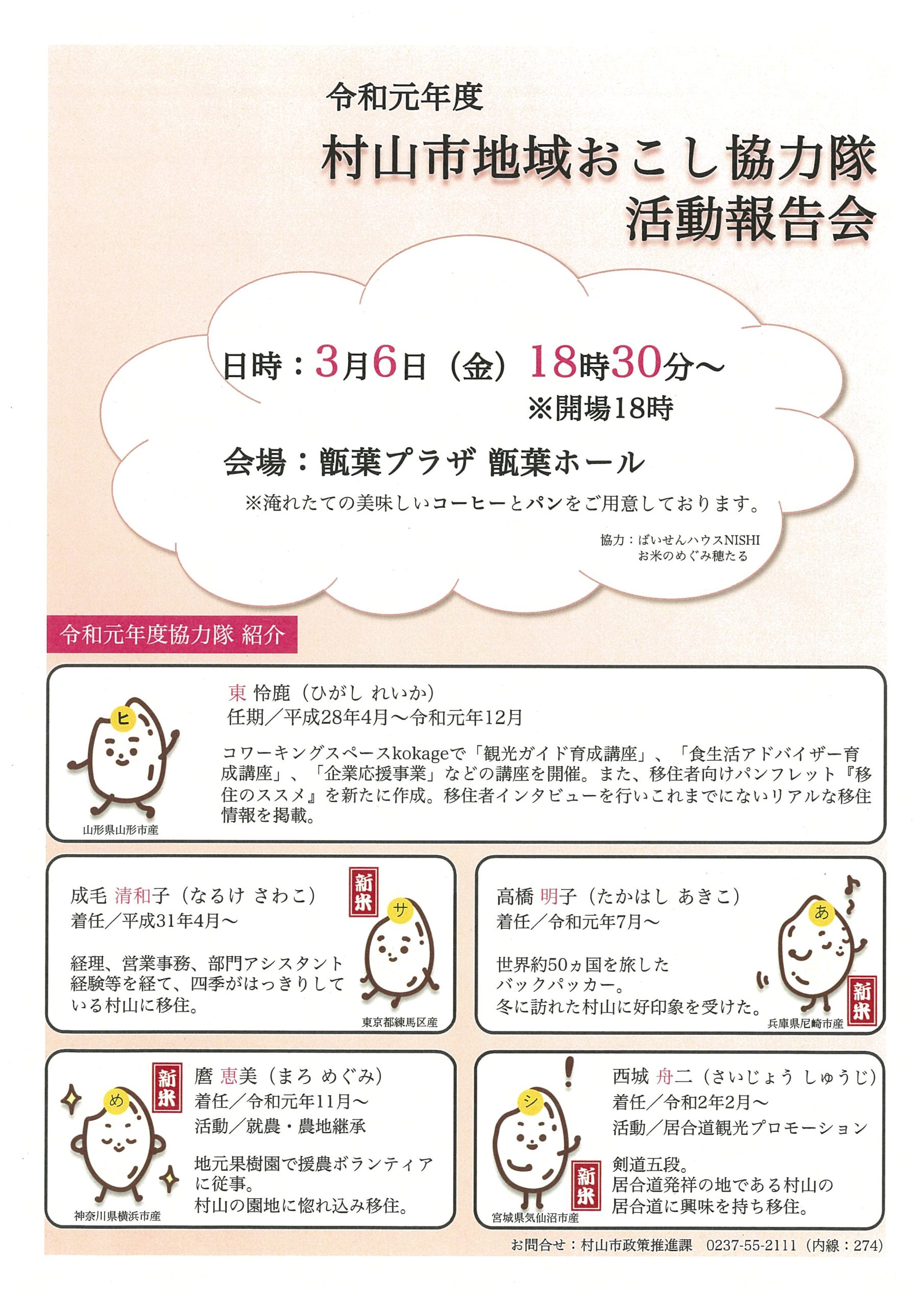2020年 3月 6日(金曜日) 18:30~ <中止>村山市地域おこし協力隊活動報告会 添付ファイル 村山市地域おこし協力隊報告会ちらし 連絡先 村山市政策推進課 0237-55-2111(内線:274) 記事番号:4748