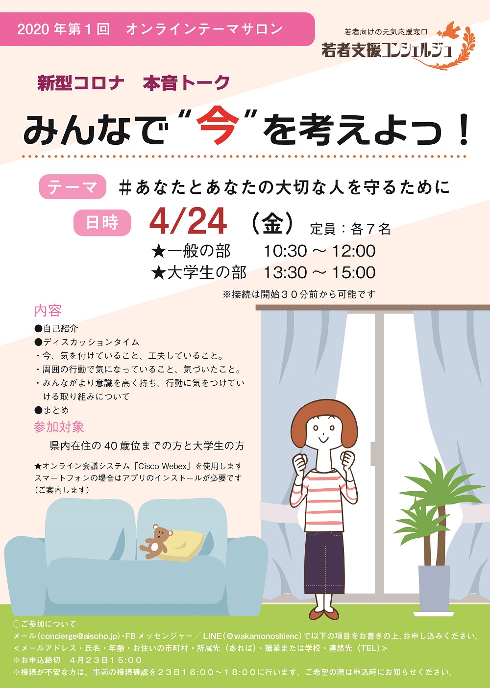 新型コロナウイルスが全国で拡大を見せる今、若者のみんなは何を考え、何に気を付けているのでしょう?今年度1回目のサロンは「#あなたとあなたの大切な人を守るために」をテーマに、それぞれの“今”についてお話しします。
