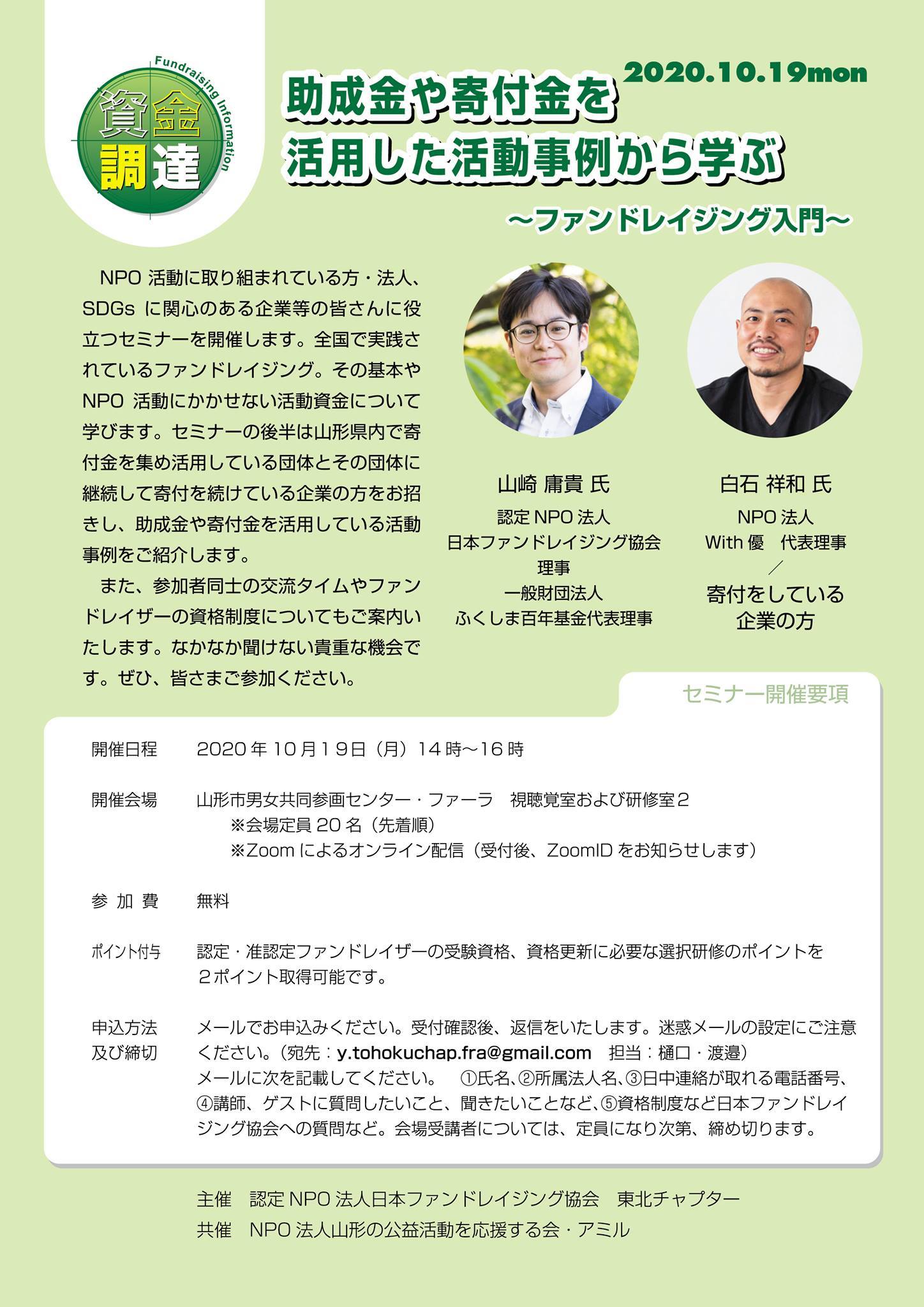 2020年 10月 19日(月曜日) 14:00~ 助成金や寄付金を活用した活動事例から学ぶ~ファンドレイジング入門~ 会場:山形県男女共同参画センター・ファーラ 視聴覚室および研修室2 (山形県山形市城西町2丁目2−22) 記事番号:7324