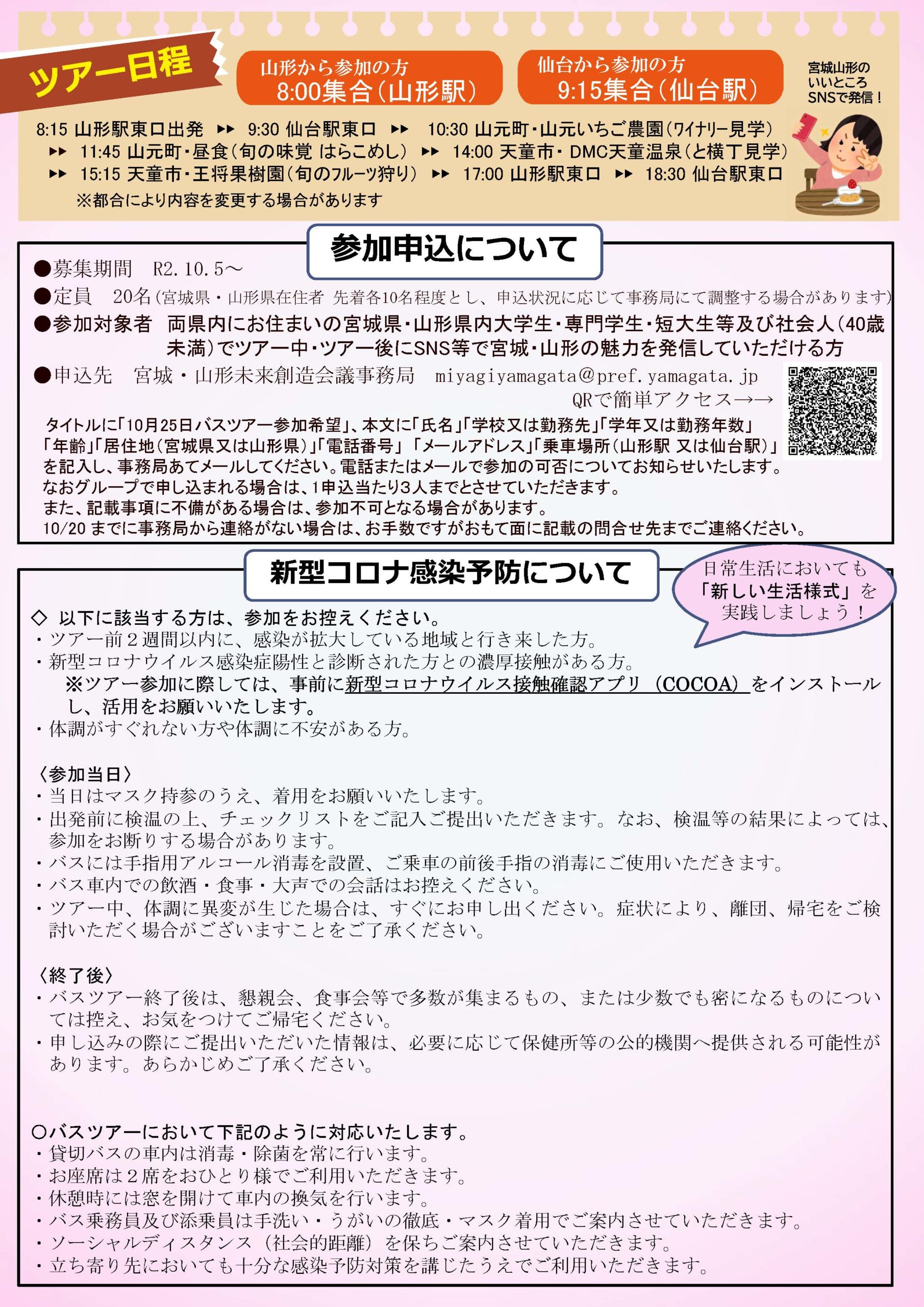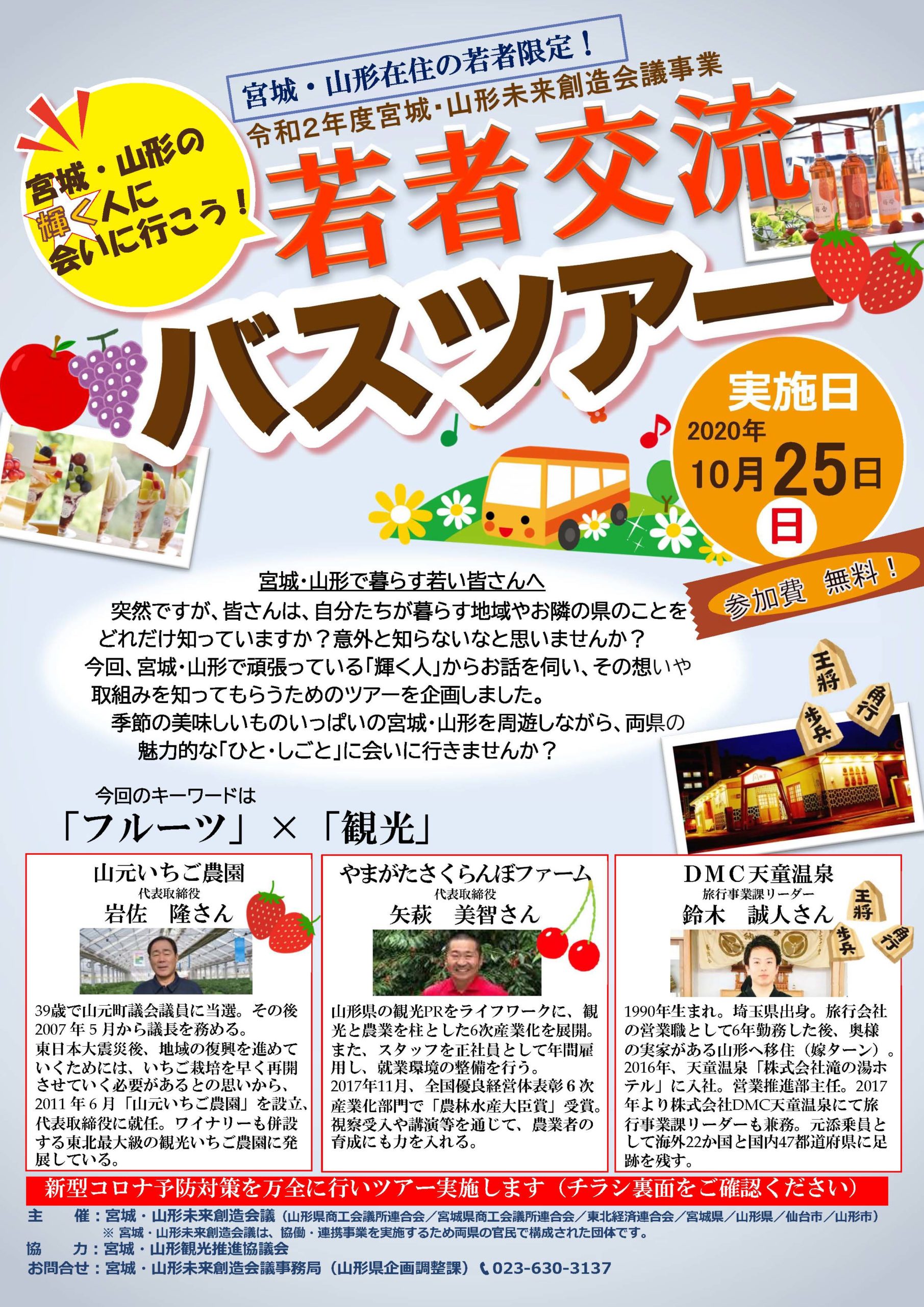 2020年 10月 25日(日曜日) 8:00~ 宮城・山形の輝く人に会いに行こう!若者交流バスツアー 添付ファイル 若者交流バスツアーチラシ 連絡先 宮城・山形未来創造会議事務局(山形県企画調整課)023-630-3137 記事番号:7497