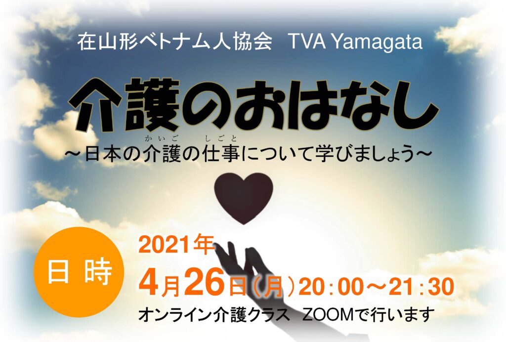 2021年 4月 26日(月曜日) 20:00~ オンライン介護クラス 介護のプロのたかはし先生から、とても大事な話を聞くことができます。 このようなオンラインはなかなかないので、ぜひご参加ください。 ◆介護に興味(きょうみ)のある方 ◆介護の仕事をしたい方 ◆介護の仕事をしている方 ◆介護施設の方(外国人を雇用している企業様) 添付ファイル チラシ 連絡先 tva.yamagata@gmail.com 記事番号:9960