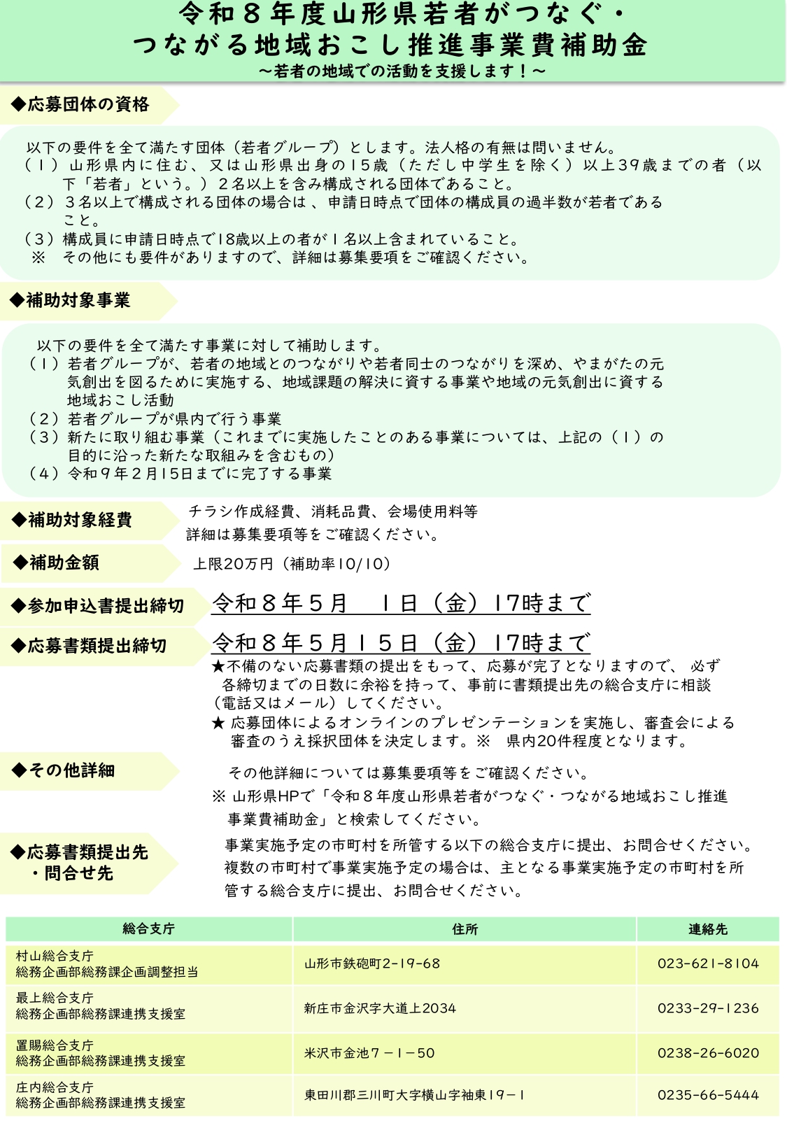 | 補助事業名称 | 令和8年度山形県若者がつなぐ・つながる地域おこし推進事業費補助金 |