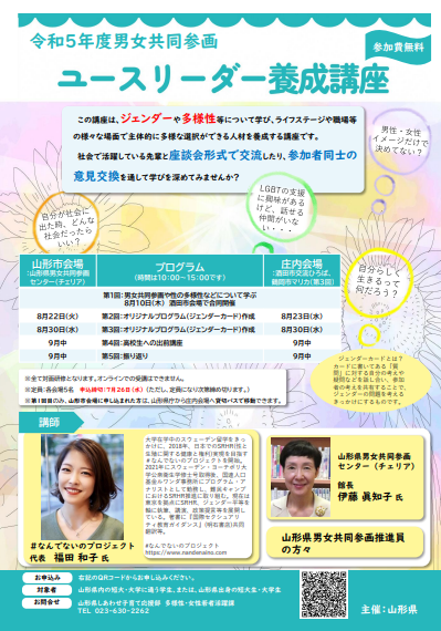 県ã§ã¯ã“ã®ãŸã³ã€å±±å½¢çœŒå†…ç‰ã®çŸå¤§ãƒ»å¤§å¦ã«é€šã†å¦ç”Ÿã‚’対象ã¨ã—ã€ã‚¸ã‚§ãƒ³ãƒ€ãƒ¼ã‚„多様性ç‰ã«ã¤ã„ã¦å¦ã³ã€ãƒ©ã‚¤ãƒ•ステージやè·å ´ç‰ã®æ§˜ã€…ãªå ´é¢ã§ä¸»ä½“çš„ã«å¤šæ§˜ãªé¸æŠžãŒã§ãる人æã‚’育æˆã™ã‚‹ã“ã¨ã‚’目的ã¨ã—ã¦è¬›åº§ã‚’開催ã—ã¾ã—ãŸã€‚