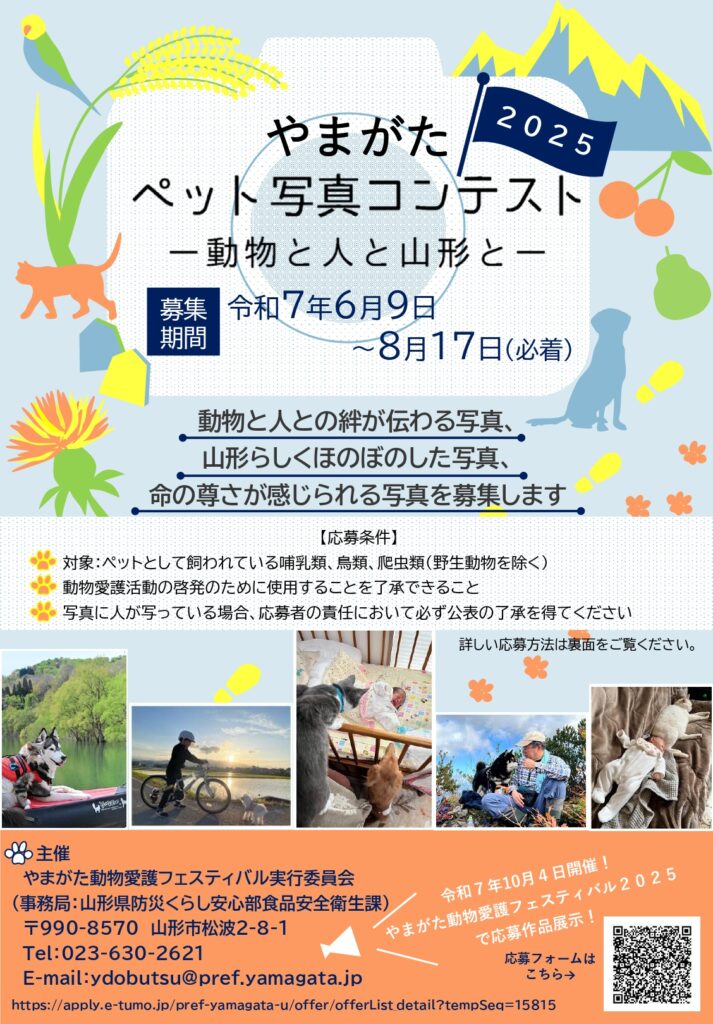 動物ã¨äººã¨ã®çµ†ãŒä¼ã‚る写真ã€å±±å½¢ã‚‰ã—ãã»ã®ã¼ã®ã—ãŸå†™çœŸã€å‘½ã®å°Šã•ãŒæ„Ÿã˜ã‚‰ã‚Œã‚‹å†™çœŸã‚’募集ã—ã¾ã™ï¼å…¥è³žè€…ã«ã¯è¡¨å½°çжã¨è¨˜å¿µå“を贈呈ã™ã‚‹ã¨ã¨ã‚‚ã«ã€å…¥è³žä½œå“を県HPã«æŽ²è¼‰ã¨çœŒåºãƒãƒ“ーã«å±•示ã„ãŸã—ã¾ã™ï¼ˆï¼™æœˆ16日~30日)。ã¾ãŸã€10月4日ã«ã¯ã‚„ã¾ãŒãŸå‹•物愛è·ãƒ•ェスティãƒãƒ«ä¼šå ´ã¨ãªã‚‹æ–‡ç¿”館内ã§å±•示ã„ãŸã—ã¾ã™ã€‚