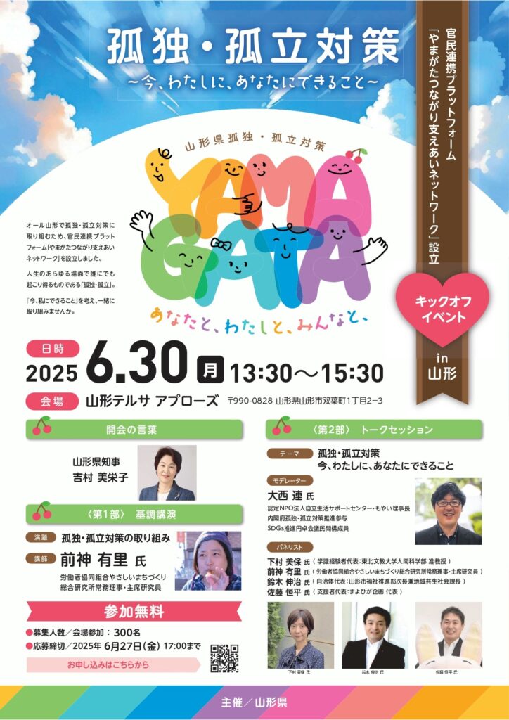 県ã§ã¯ã€ã‚ªãƒ¼ãƒ«å±±å½¢ã§ç¤¾ä¼šã®ã‚らゆる分野ã«ãŠã„ã¦å¤ç‹¬ãƒ»å¤ç«‹å¯¾ç–ã®æŽ¨é€²ã‚’å›³ã£ã¦ã„ããŸã‚ã€ä»¤å’Œï¼—年4月ã«å®˜æ°‘連æºã®ãƒ—ラットホーム「やã¾ãŒãŸã¤ãªãŒã‚Šæ”¯ãˆã‚ã„ãƒãƒƒãƒˆãƒ¯ãƒ¼ã‚¯ã€ã‚’è¨ç«‹ã—ã¾ã—ãŸã€‚