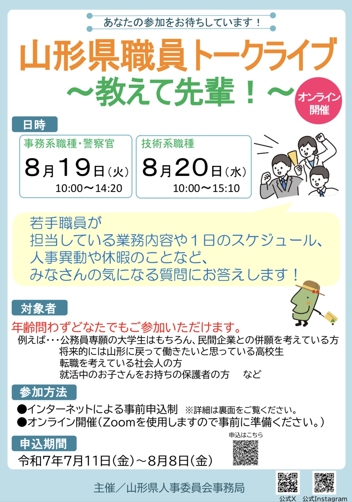 山形県è·å“¡ã®ä»•事ã®é…力を知ã£ã¦ã„ãŸã ããŸã‚ã€ã€Œå±±å½¢çœŒè·å“¡ãƒˆãƒ¼ã‚¯ãƒ©ã‚¤ãƒ– ~教ãˆã¦å…ˆè¼©ï¼ï½žã€ã‚’開催ã—ã¾ã™ã€‚