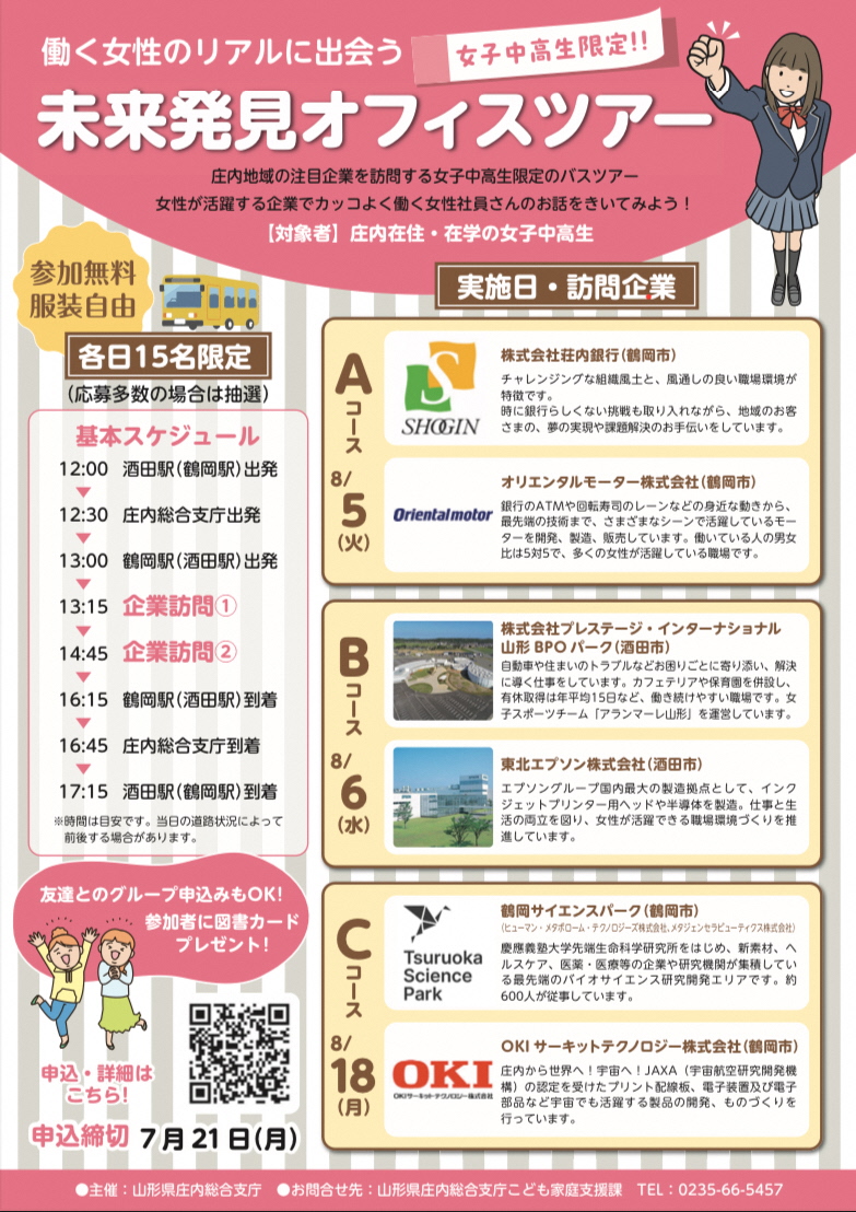 ã€€åœ°å…ƒä¼æ¥ã‚„女性ã®å¤šæ§˜ãªåƒãæ–¹ç‰ã¸ã®ç†è§£ã‚’æ·±ã‚ã‚‹ãŸã‚ã€å¥³æ€§æ´»èºã«å–り組む庄内地域ã®ä¼æ¥ã‚’訪å•ã™ã‚‹ã€å¥³åä¸é«˜ç”Ÿã«é™å®šã—ãŸã€Œæœªæ¥ç™ºè¦‹ã‚ªãƒ•ィスツアーã€ã‚’開催ã—ã¾ã™ã€‚