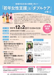 ã“ã©ã‚‚ã¨å¤§äººã®ç‹é–“ã«ã‚る若年層ãŒã€åˆ¶åº¦ã®ç‹é–“ã§æ”¯æ´ãŒå—ã‘られãªã„ç¾å®ŸãŒã‚りã¾ã™ã€‚ã¾ãŸã€å¹³å‡åˆå©šå¹´é½¢ãƒ»åˆç”£å¹´é½¢ã®ä¸Šæ˜‡ã«ã‚ˆã‚Šã€è‚²å…ã¨ä»‹è·ãŒé‡ãªã‚‹ã€Œãƒ€ãƒ–ルケアã€ãŒç¤¾ä¼šçš„リスクã¨ã—ã¦æ³¨ç›®ã•れã¦ã„ã¾ã™ã€‚æœ¬ç ”ä¿®ä¼šã§ã¯ã€è‹¥å¹´å¥³æ€§ã®å£°ã¨ãƒ€ãƒ–ルケアã®èª²é¡Œã‹ã‚‰å®Ÿæ…‹ã‚„ニーズã€åˆ¶åº¦ã‚’å¦ã³ãªãŒã‚‰åœ°åŸŸã«å¿…è¦ãªæ”¯æ´ã®ã‚り方を考ãˆã¾ã™ã€‚