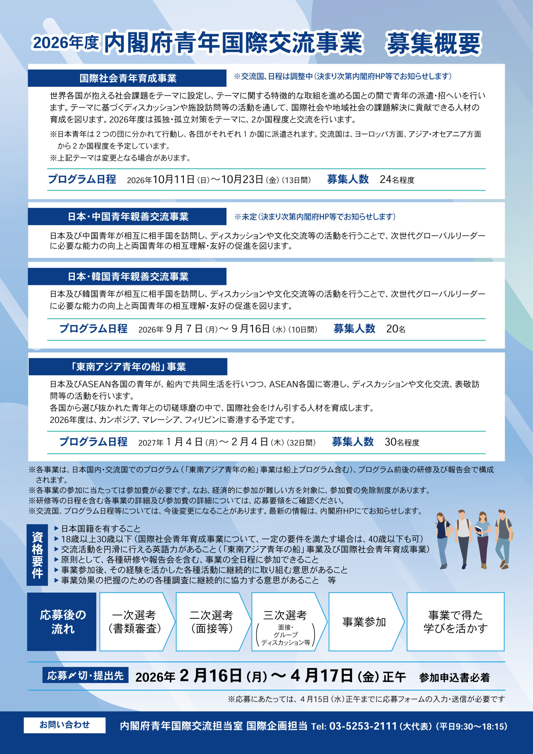 内閣府ã§ã¯ã€å›½éš›ç¤¾ä¼šã‚„åœ°åŸŸç¤¾ä¼šã§æ´»èºã™ã‚‹æ¬¡ä¸–代グãƒãƒ¼ãƒãƒ«ãƒªãƒ¼ãƒ€ãƒ¼ã®è‚²æˆã‚’目指ã—ã€ç¾åœ¨ï¼“ã¤ã®å›½éš›äº¤æµäº‹æ¥ã®å‚åŠ è€…ã‚’å‹Ÿé›†ã—ã¦ã„ã¾ã™ã€‚