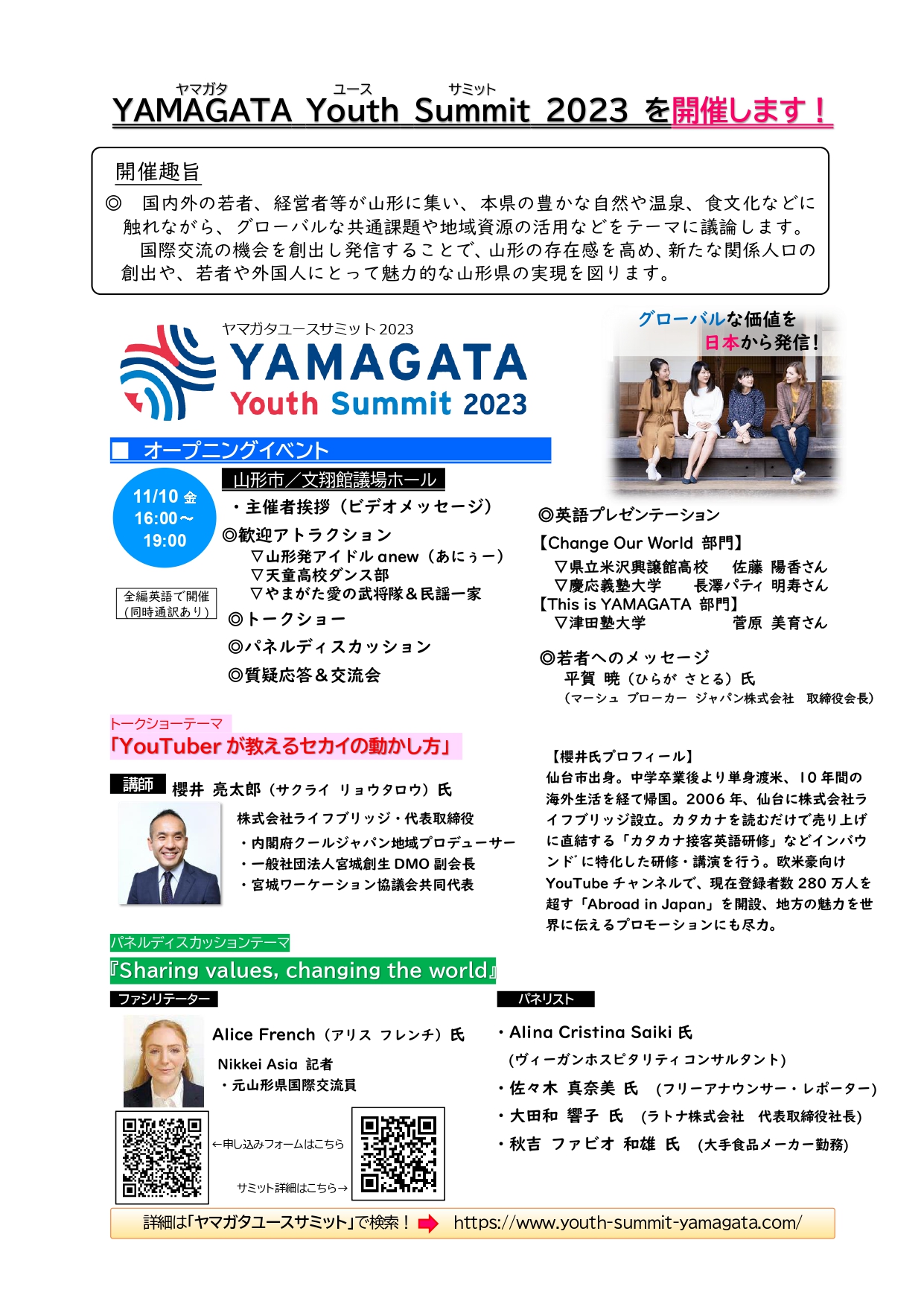 YAMAGATA Youth Summit2023 オープニングイベントの開催について