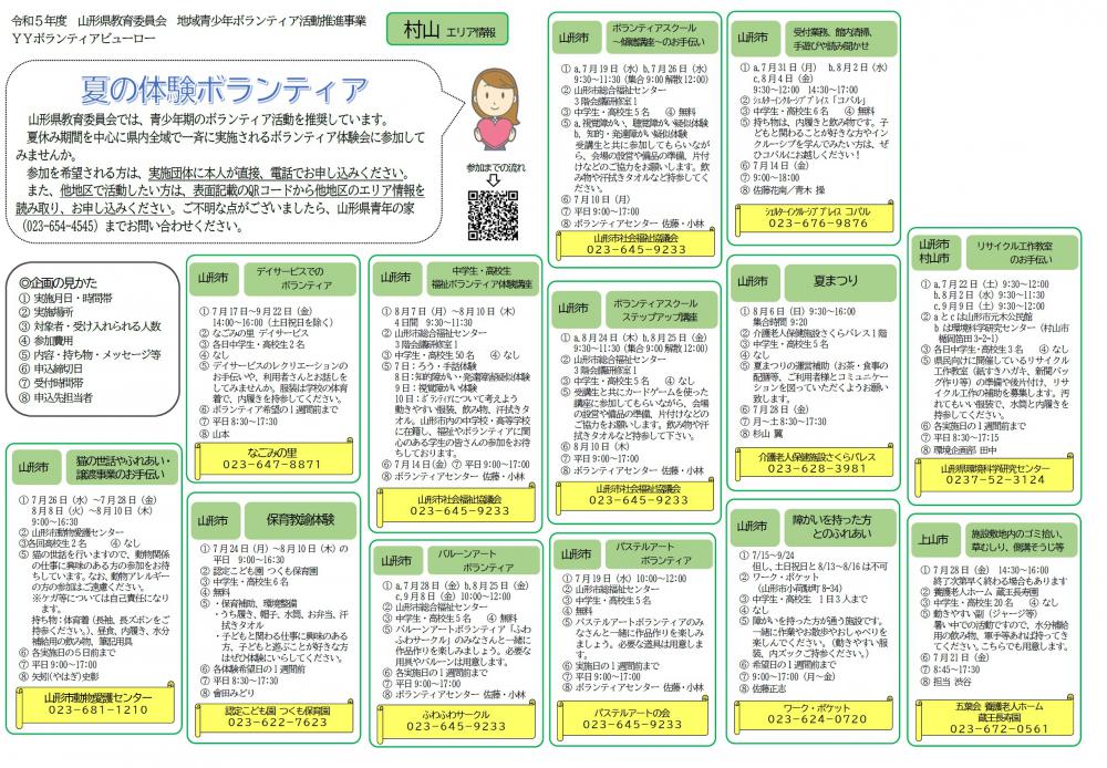 下の添付ファイル「地域別ボランティア」に、村山、最上、置賜、庄内各エリアのボランティア情報が掲載されています。