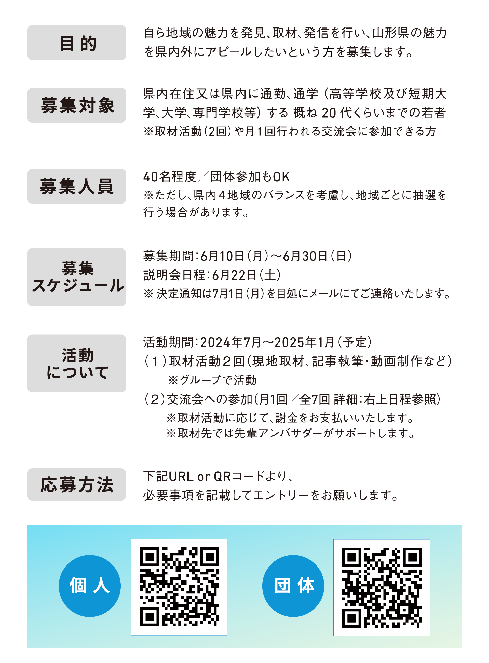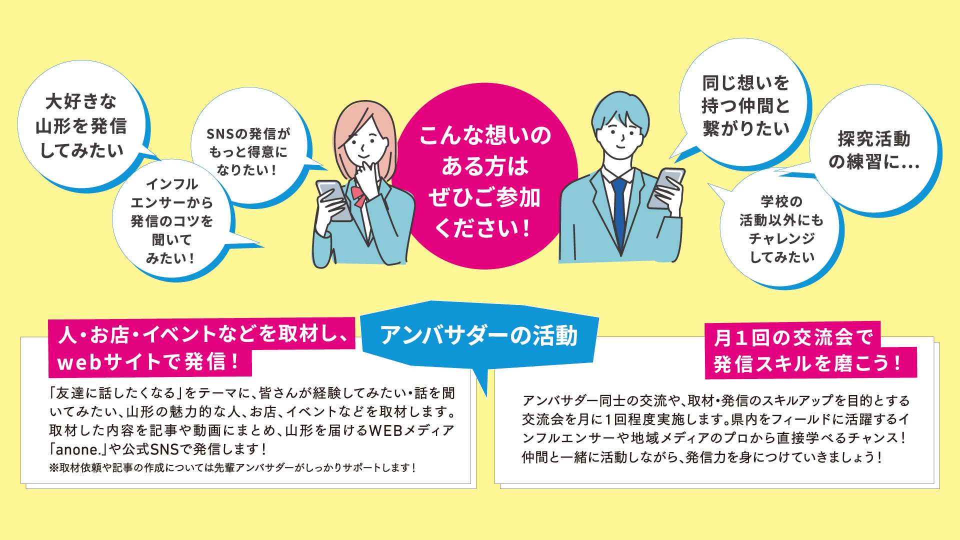 2年目を迎える「やまがた魅力発信アンバサダー事業」は、アンバサダー(高校生・専門学生・大学生等)が、各々の視点で山形の魅力を取材しWEBサイトで発信します。