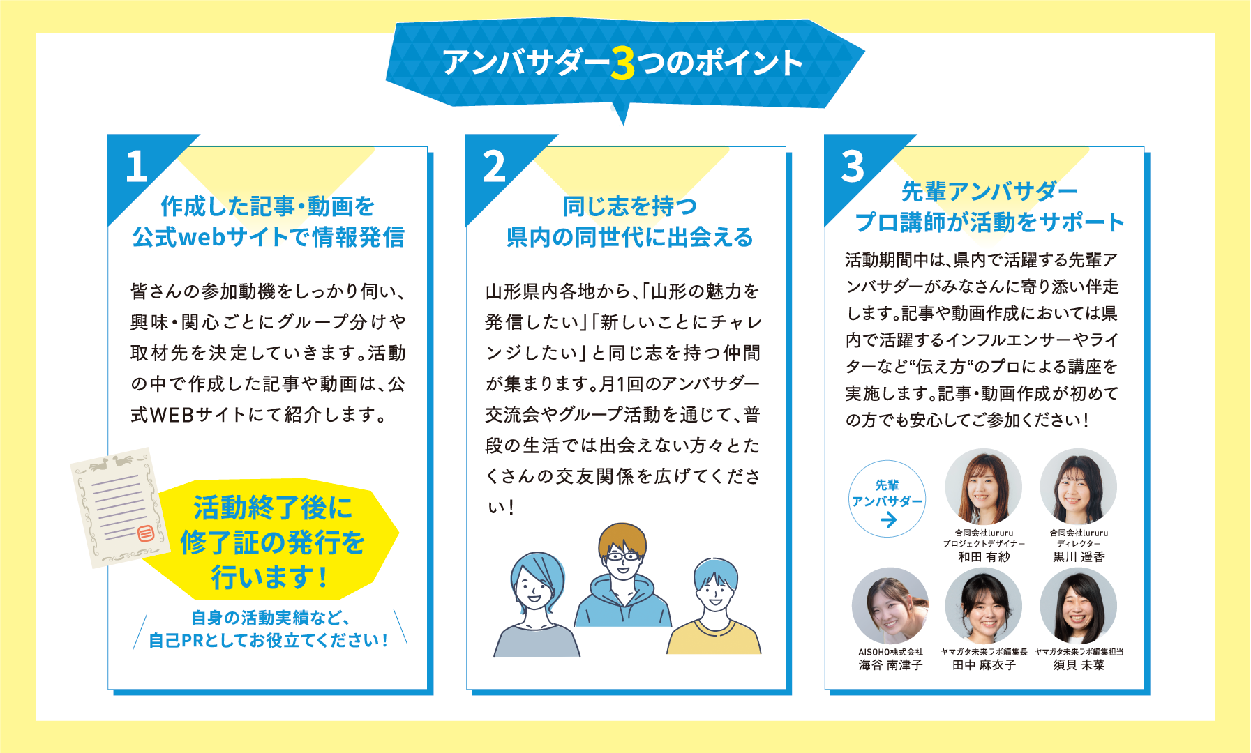 取材依頼や記事作成、動画の作成は、合同会社lururuやAISOHO株式会社、ヤマガタ未来ラボのメンバーが先輩アンバサダーがサポートしますのでご安心ください♪