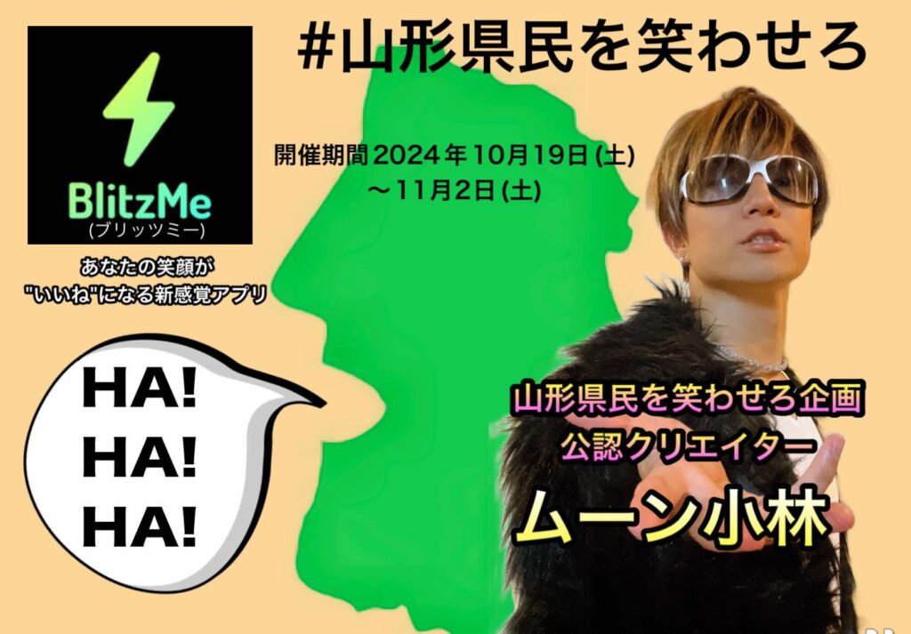 「#山形県民を笑わせろ」大会は、2024年7月9日に制定された「山形県笑いで健康づくり推進条例」の一環で開催される笑い大会。アプリでコンテンツを視聴した利用者が笑顔になった回数をカウントできるBlitzMeアプリ独自の機能を活用した企画です。
