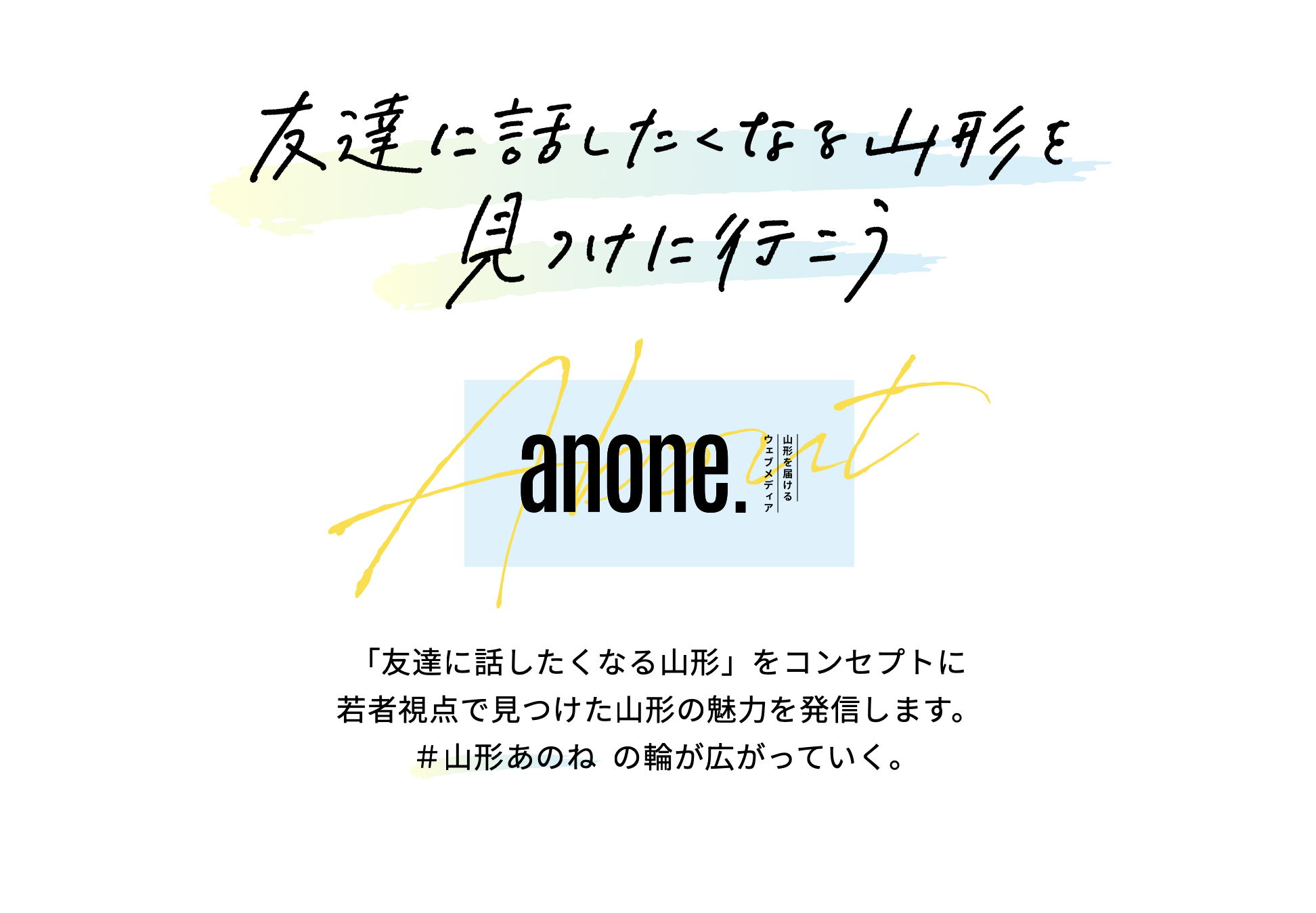 「友達に話したくなる」をテーマに、経験してみたい・話を聞いてみたい、山形の魅力的な人、お店、イベントなどを取材。取材した内容を記事や動画にまとめ、山形を届けるWEBメディア「anone.」や公式SNSで発信しています。