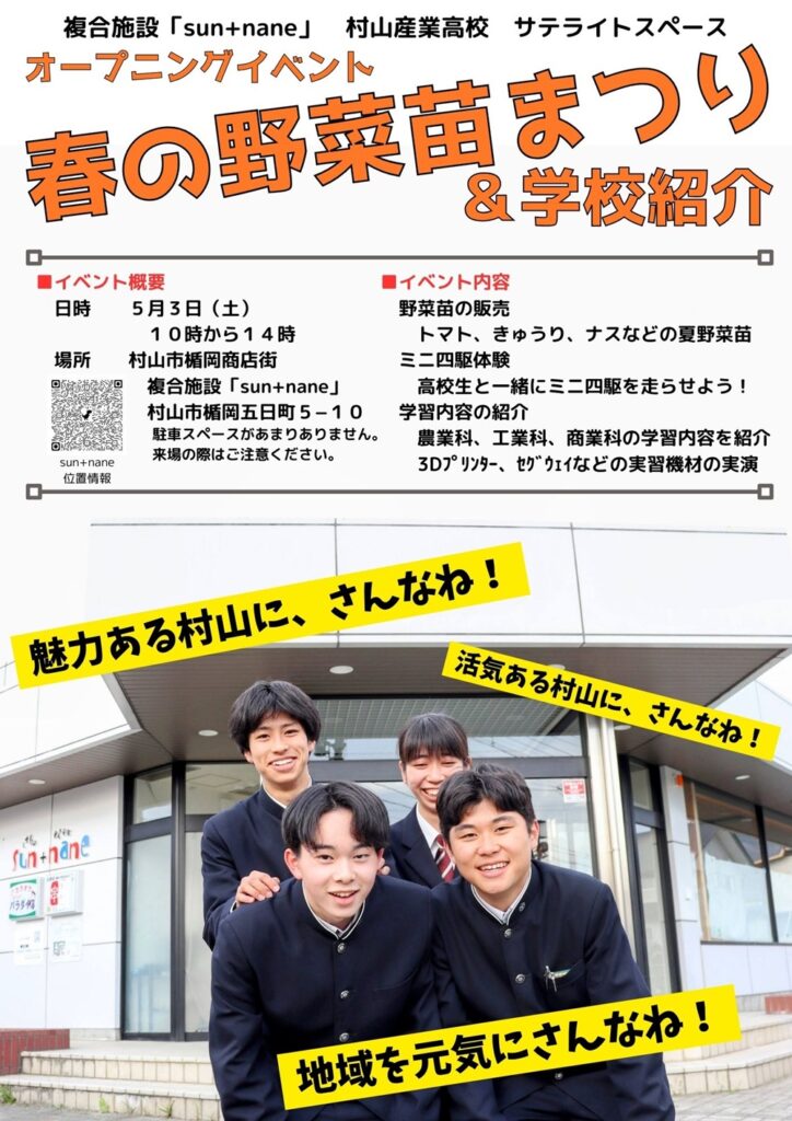 村山市の楯岡商店街に複合施設「sun+nane(さん・なね)」がオープンしました。そこに村山産業高校のサテライトスペースも設置されました。このスペースでは、地域でのフィールドワークや農産物の販売実習、公開講座などを行う予定です。