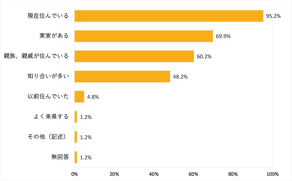 回答者の属性は、男性が61.4%と過半数を占め、年代は30代(67.5%)が最も高い結果となりました。山形県との関係としては、「現在住んでいる」が95.2%と多数でしたが、「以前住んでいた」(4.8%)、「よく来県する」(1.2%)など県外在住の人からも回答をいただきました。改めて、ご回答をありがとうございました!