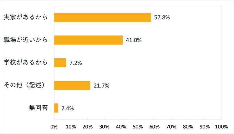 今の居住地域に住んでいる理由は「実家があるから」(57.8%)が最も高く、次いで「職場が近いから」(41.0%)でした。その他の記述では結婚などパートナーの都合によるものの回答が目立ちました。