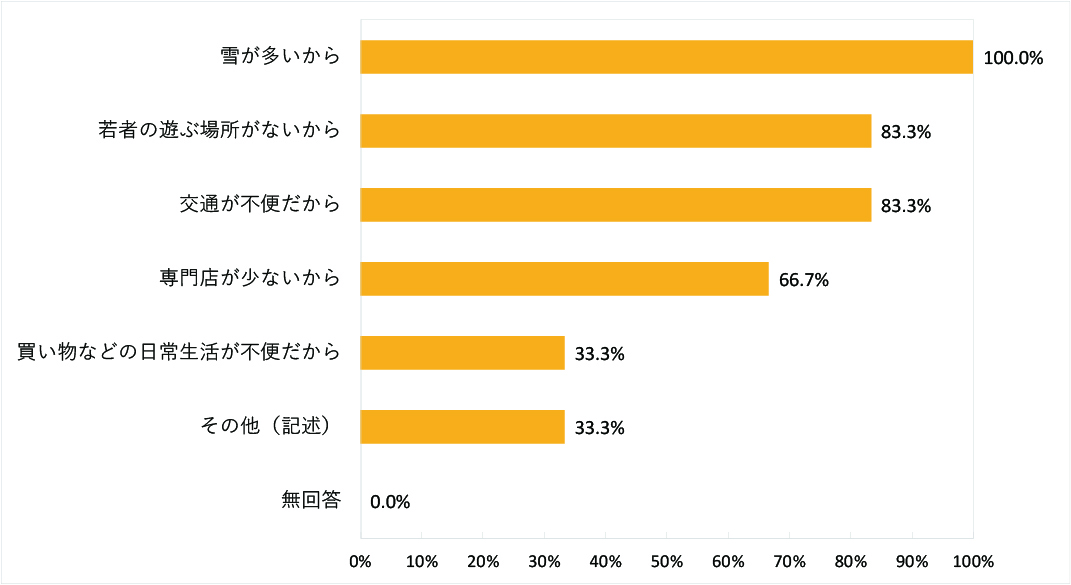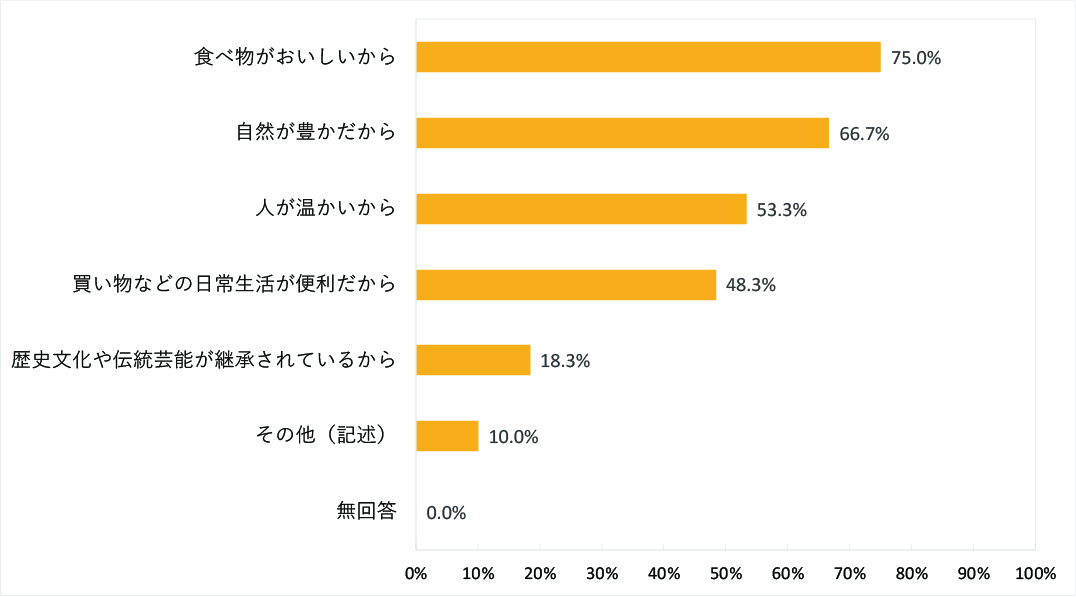 「今住んでいる地域は好きですか?」という設問に対して「はい」と回答した人の理由は「食べ物がおいしいから」(75.0%)が最も高く、「いいえ」と回答した人の理由では「雪が多いから」(100%)が最も高い結果となりました。