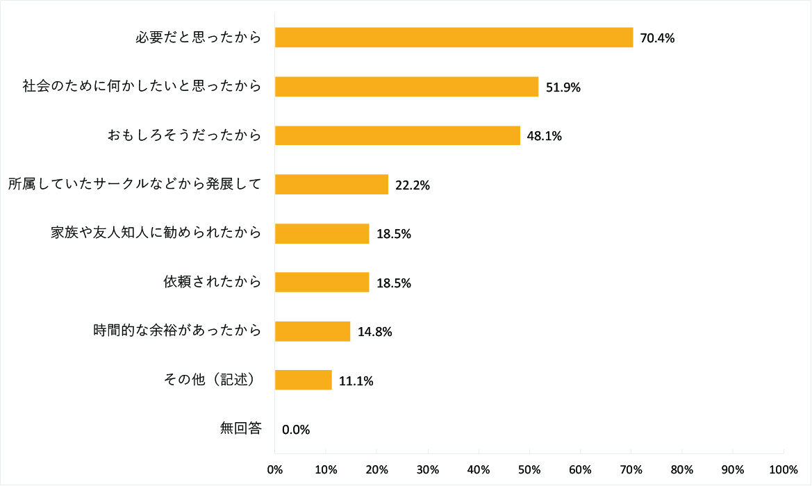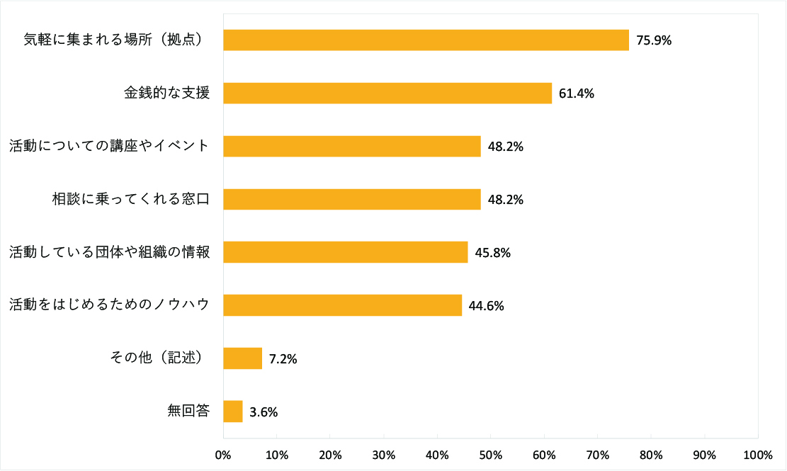 「はい」の回答した人のうち、「まちづくり、むらづくり活動」に関わる人は44.4%、「文化・芸術・スポーツの振興」に関わる人は37.0%となり、活動のきっかけは「必要だと思ったから」(70.4%)が最も高い結果となりました。また、「活動をしたい時にあったらよいと思うこと」の設問では、「気軽に集まれる場所(拠点)」(75.9%)と「金銭的な支援」(61.4%)が過半数を超えました。