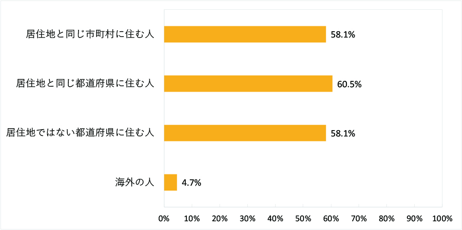 仲良くなった人の在住地域を尋ねたところ、「同じ市町村」、「同じ都道府県」、「ちがう都道府県」の3項目とも60%前後となっており、趣味や活動で仲良くなる人に距離的な障壁はみられないという結果となりました。