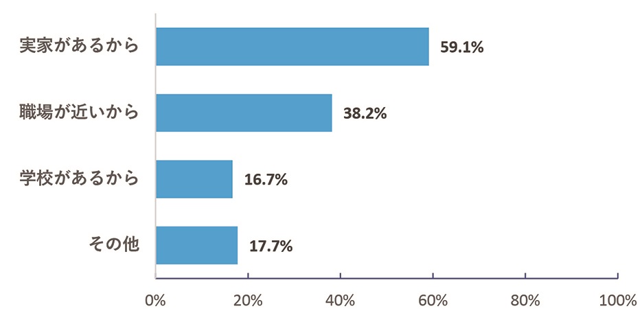 今の居住地域に住んでいる理由は「実家があるから」(59.1%)が最も高く、次いで「職場が近いから」(38.2%)でした。その他の記述では結婚などパートナーの都合によるものの回答が目立ちました。